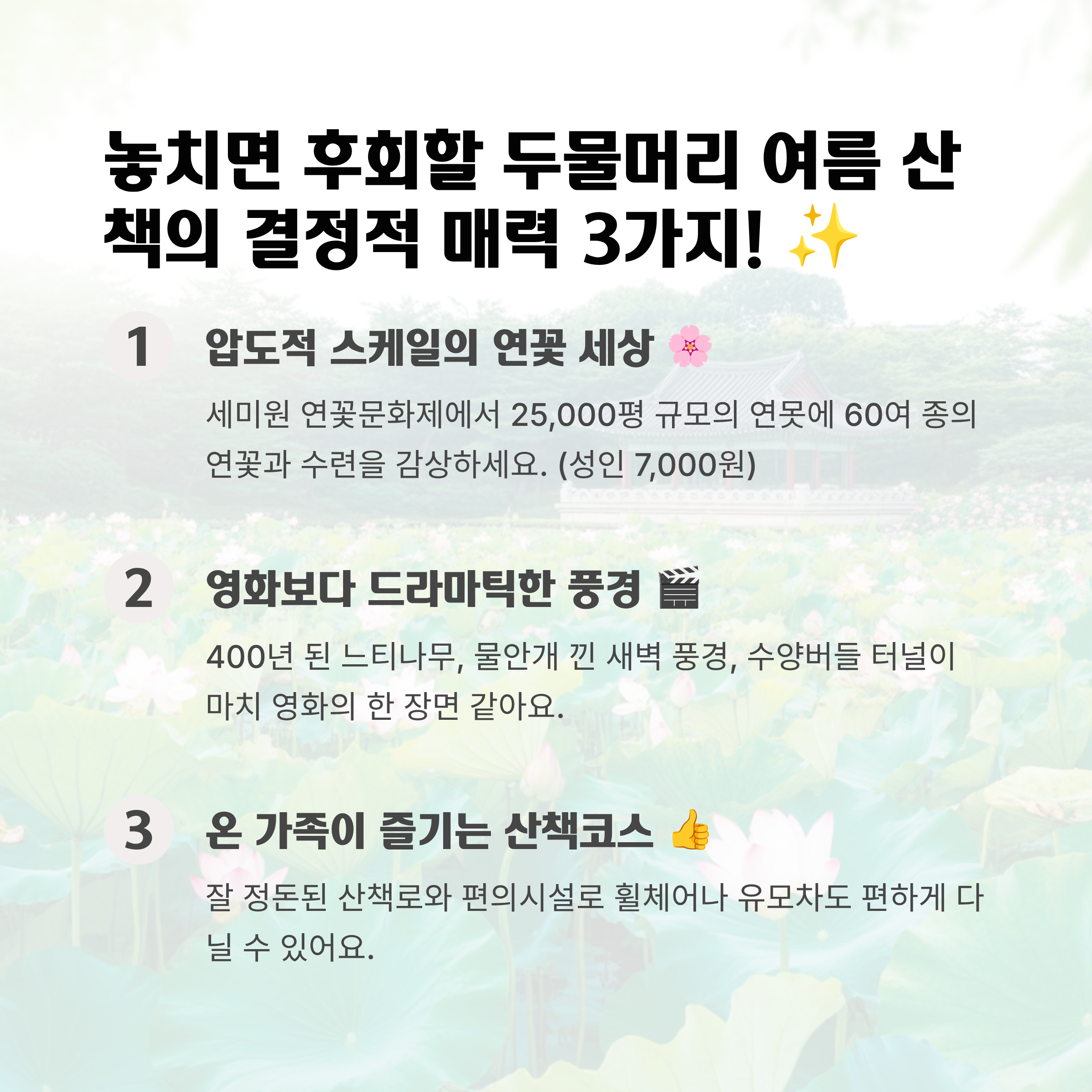 서울 근교 힐링 여행, 양평 두물머리 여름 산책 🚗 답답한 일상을 벗어나고 싶은 여러분을 위해, 서울에서 한 시간이면 닿는 양평 두물머리의 여름 산책 코스부터 연꽃 명소, 실용적인 꿀팁까지 모두 알려드릴게요!