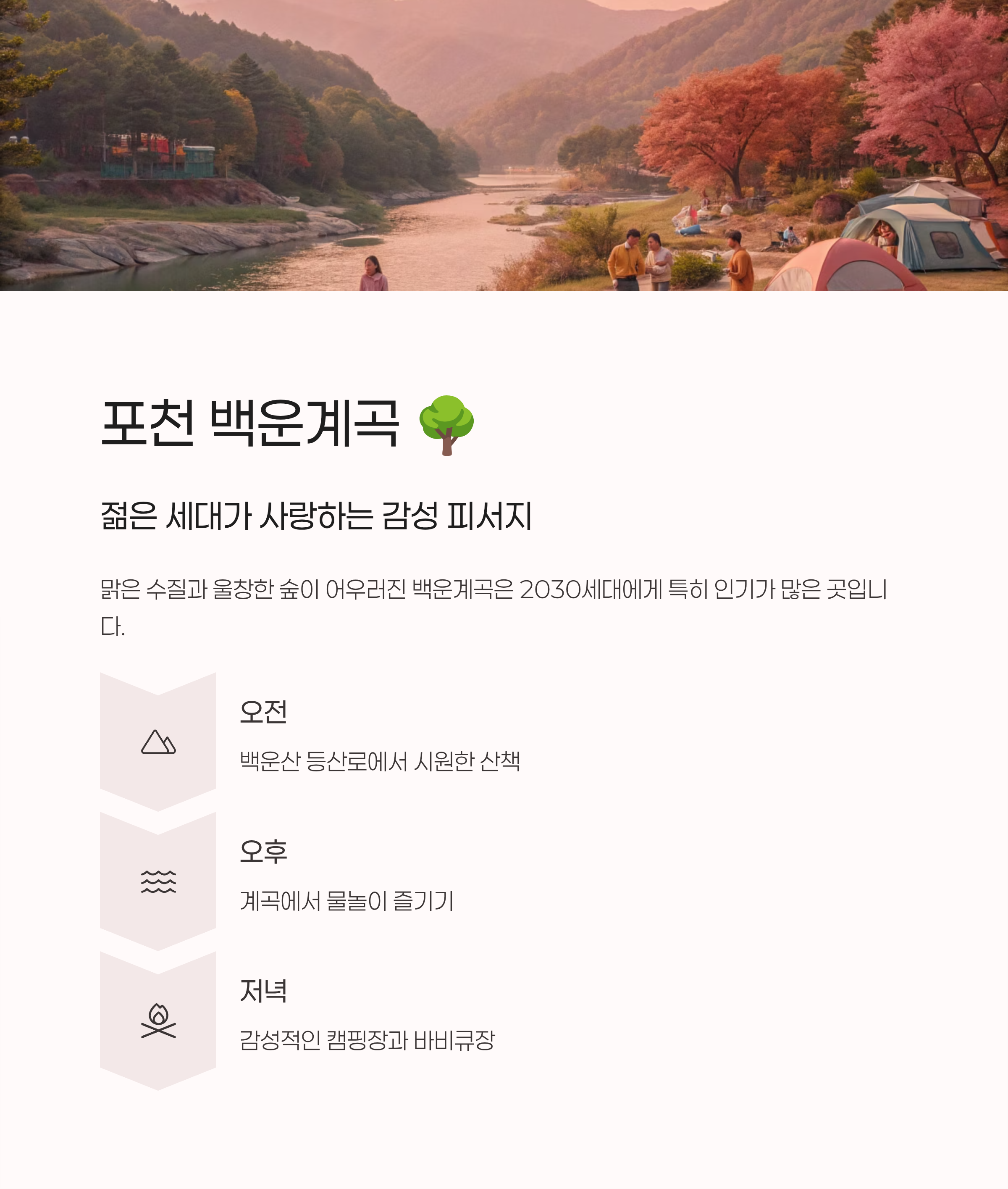 맑은 수질과 울창한 숲이 어우러진 백운계곡은 2030세대에게 특히 인기가 많더라고요. 제가 갔을 때도 계곡 옆에 예쁜 캠핑장이나 바비큐장이 많아서 감성적인 분위기 속에서 하루를 보낼 수 있었어요. 백운산 등산로와 연계하면 오전에 시원한 산책을 하고 오후에 물놀이를 즐기는 완벽한 코스가 완성됩니다.
