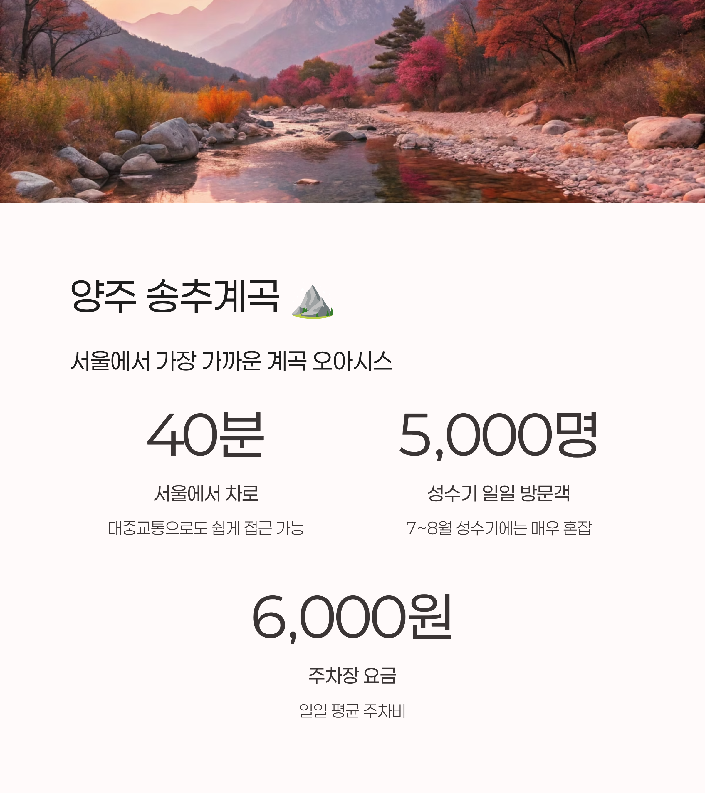 - 대중교통 이용률: 접근성이 좋은 우이동계곡, 송추계곡 등은 대중교통 이용객이 꾸준히 늘어나는 추세입니다.
