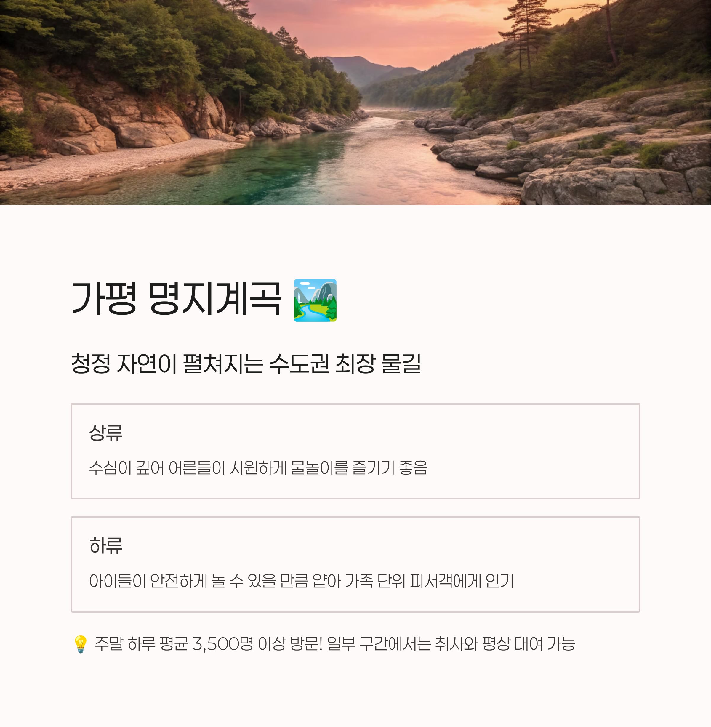 - 안전은 필수! 특히 장마철 이후에는 계곡물이 불어날 수 있으니 유아 동반 가정은 각별히 주의해야 해요.