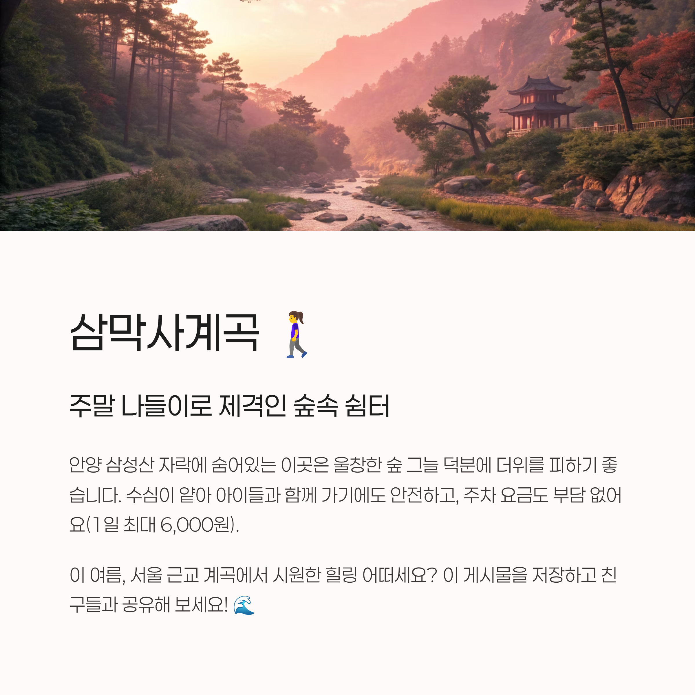 푹푹 찌는 듯한 폭염, 에어컨 바람 아래만 있기에는 어딘가 답답하게 느껴지는 요즘이죠? 저도 그렇거든요. 시원한 계곡물에 발 담그고, 숲 내음을 맡으며 온몸으로 힐링하고 싶은 마음이 간절했어요. 그런데 막상 떠나려고 하면 "어디가 좋지?", "사람은 너무 많지 않을까?", "주차는 편할까?" 등등 고민이 한두 가지가 아니더라고요.