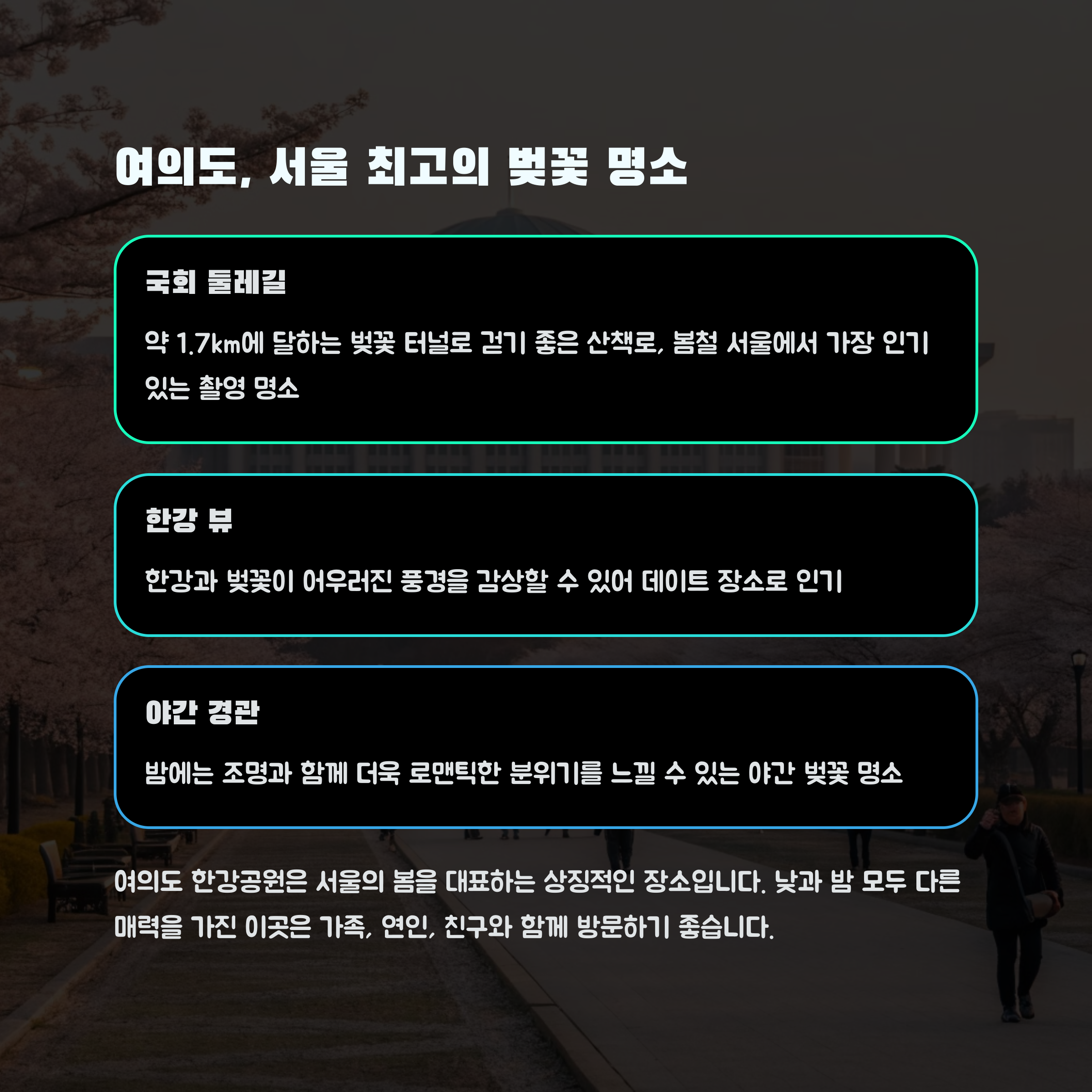 서울 벚꽃하면 빼놓을 수 없는 대표 명소입니다. 국회의사당 뒤편을 따라 1.7km에 펼쳐지는 벚꽃 터널과 '여의도 봄꽃축제'는 전국적으로 유명하죠. - 야간 조명과 함께 즐기면 더욱 로맨틱한 분위기를 느낄 수 있어요.