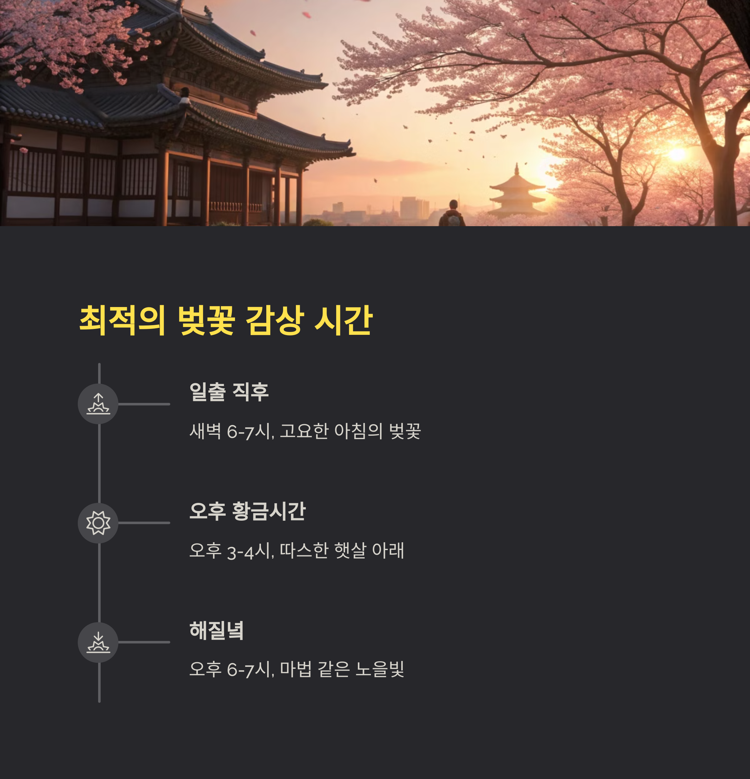 - 🌄 아침 일출 직후: 조용하고 부드러운 빛 속 벚꽃 감상