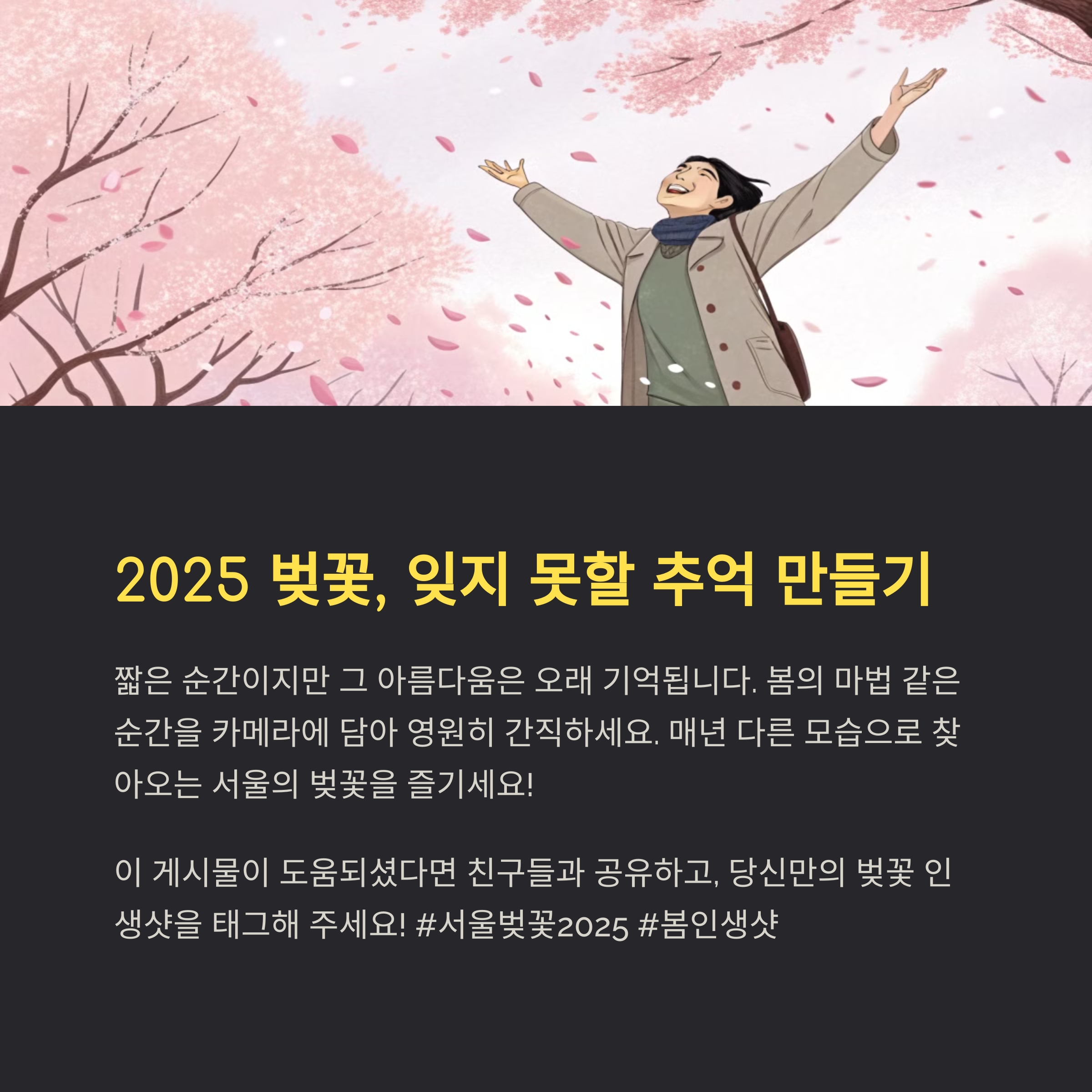 혹시 여러분만의 벚꽃 명소나 추억이 있으신가요? 댓글로 공유해주세요! 이 정보가 유용했다면, 주변 분들에게도 공유해주시면 감사하겠습니다. 함께 2025년 벚꽃을 즐겨요! 🌸