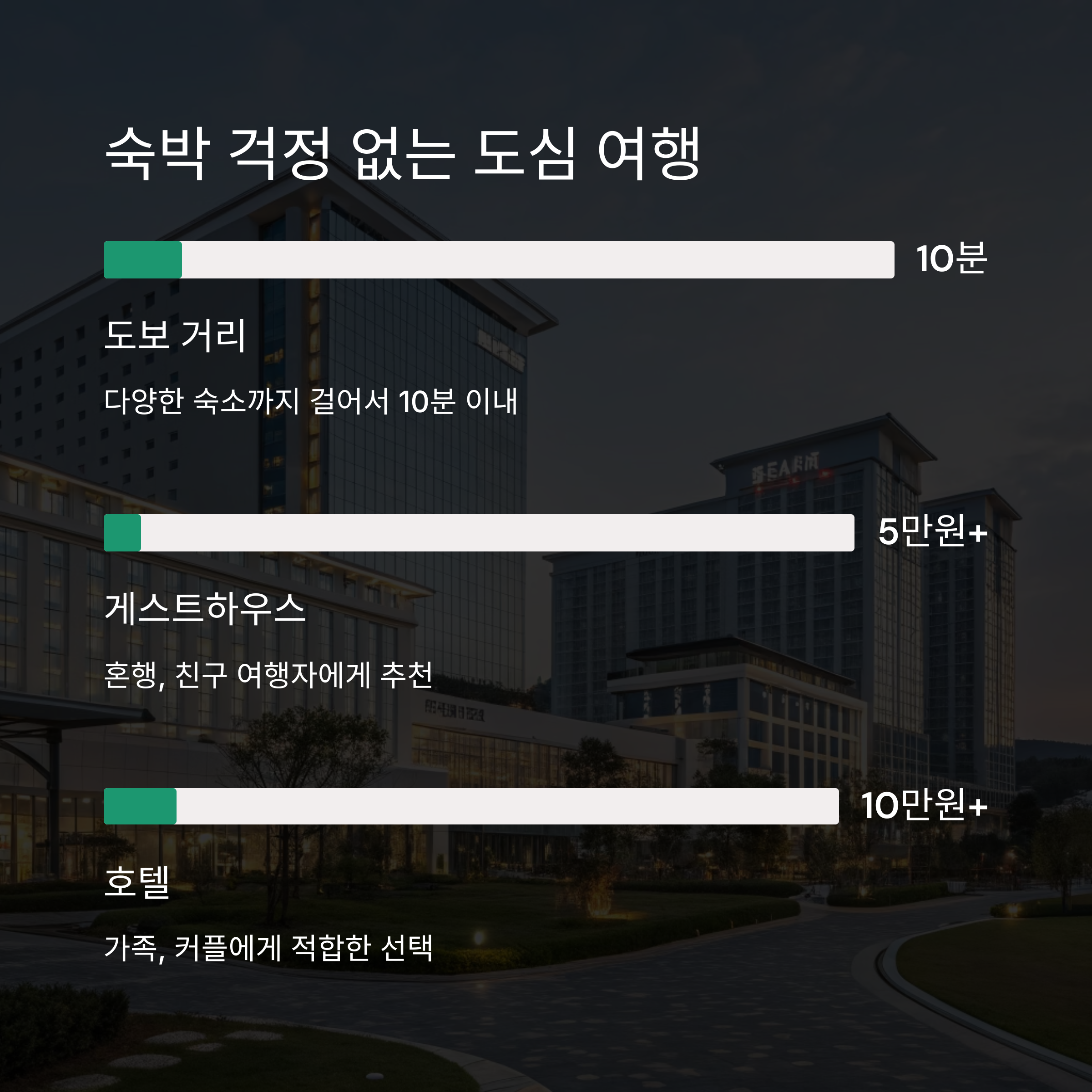 | 호텔 | 10~20만 원 | 가족, 커플 |
