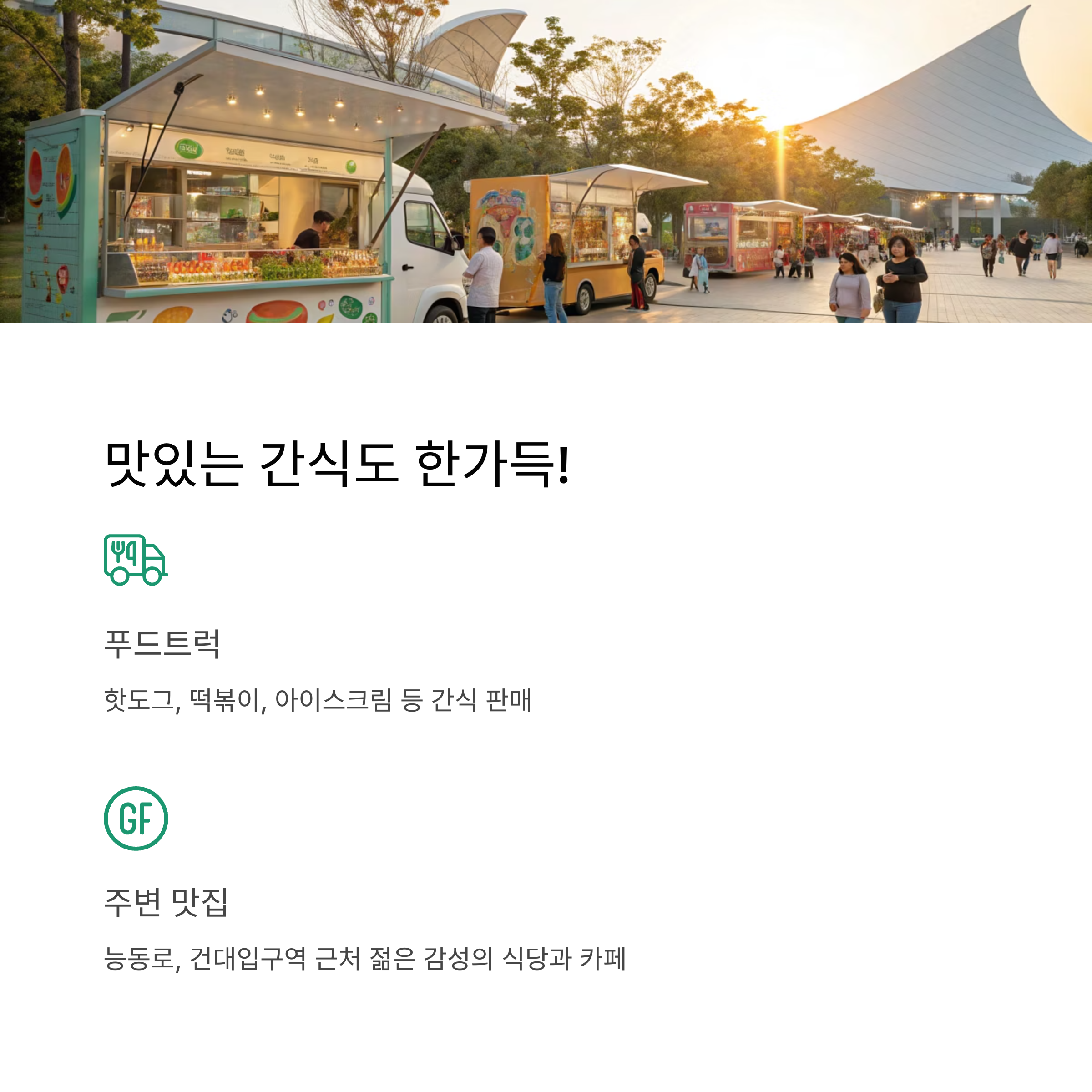 공원 내 푸드트럭에서는 핫도그, 떡볶이, 아이스크림 등 간단한 간식을