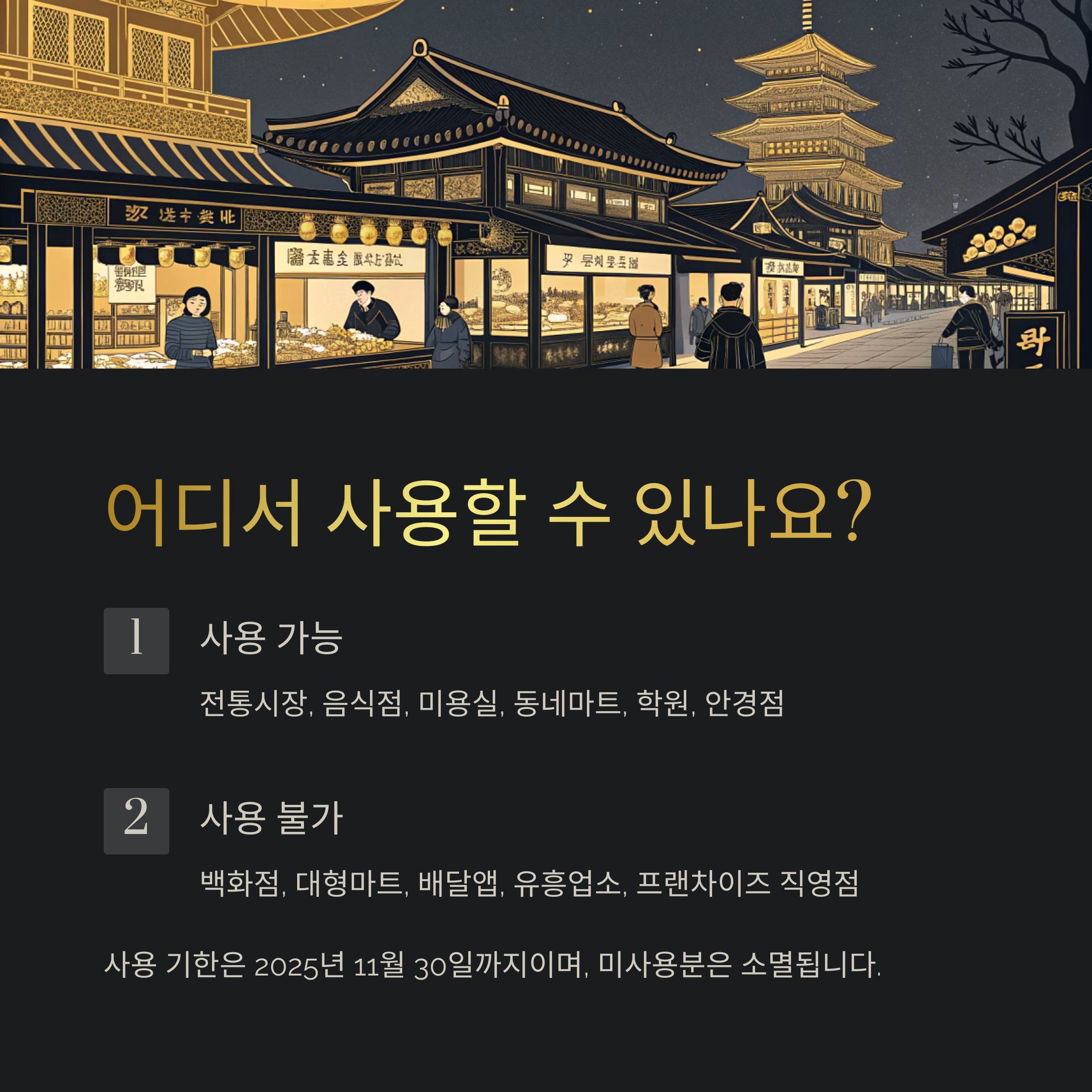 사용 지역은 주소지 기준이며, 온라인 또는 대형 유통업체 사용은 불가능합니다.