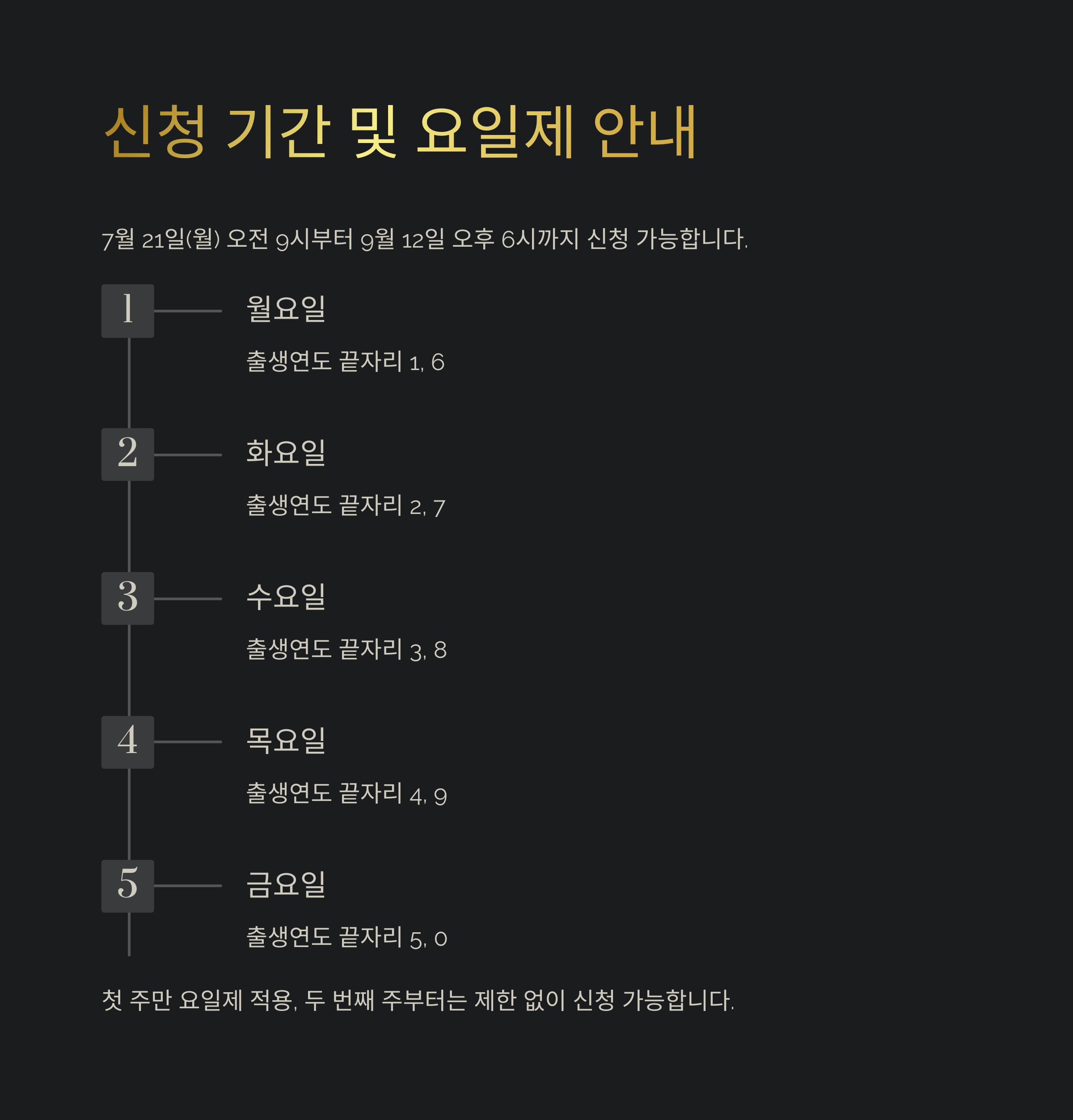단, 첫 주(7월 21~25일)는 출생연도 끝자리에 따른 요일제가 적용됩니다.