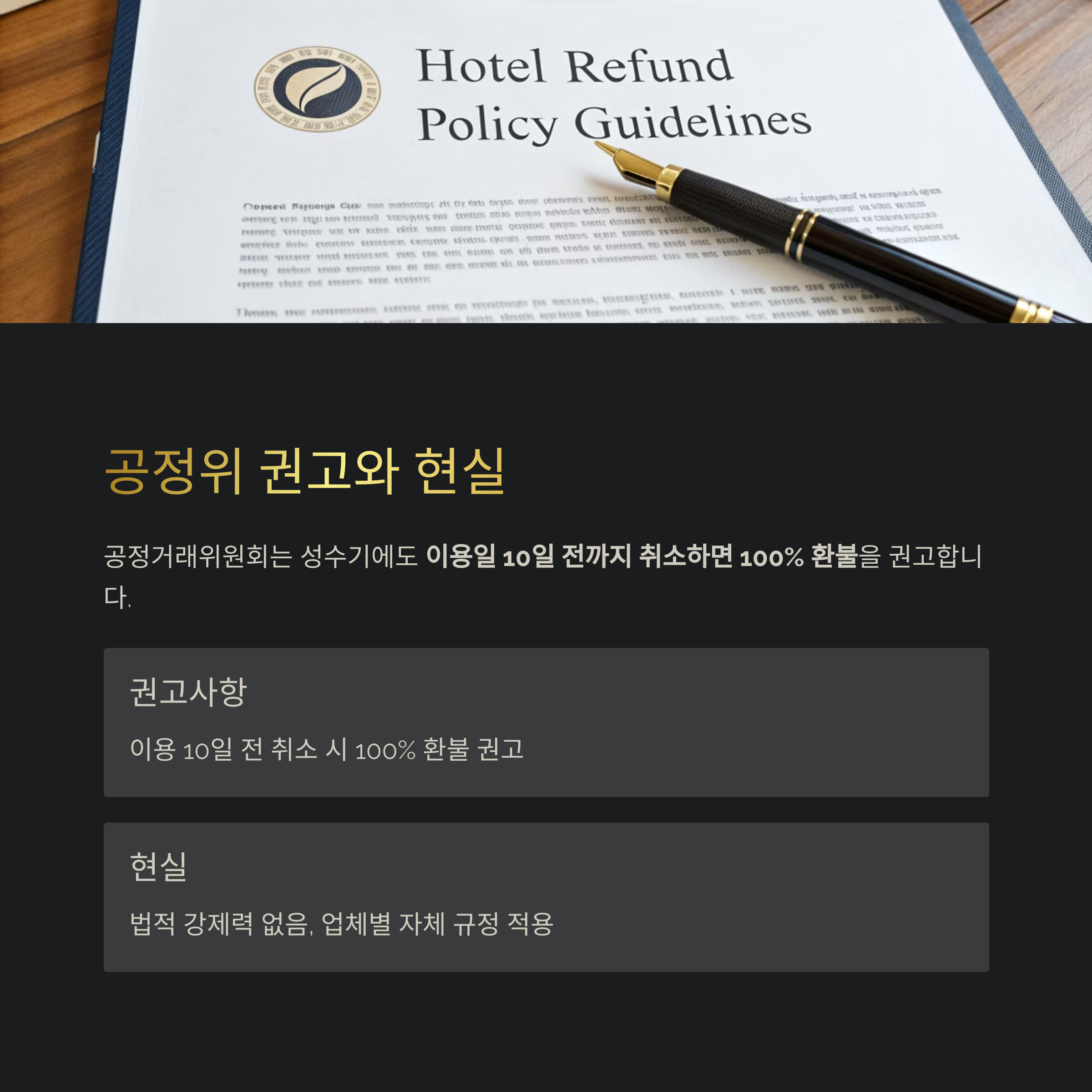 공정거래위원회는 성수기에도 이용일 10일 전까지 취소하면 100% 환불을 권고하고 있습니다.