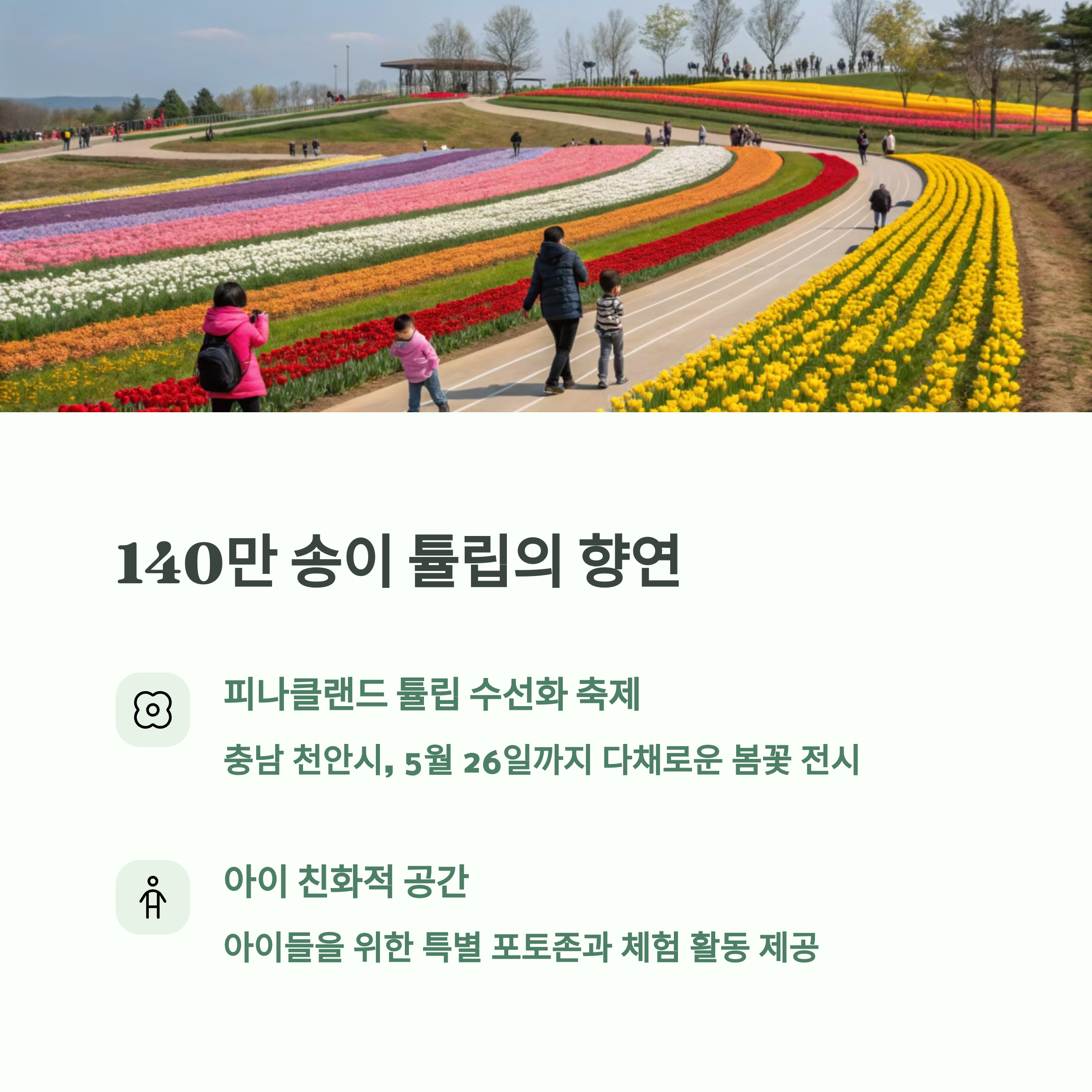 - 충남 피나클랜드 튤립 수선화 축제: 5월 26일까지