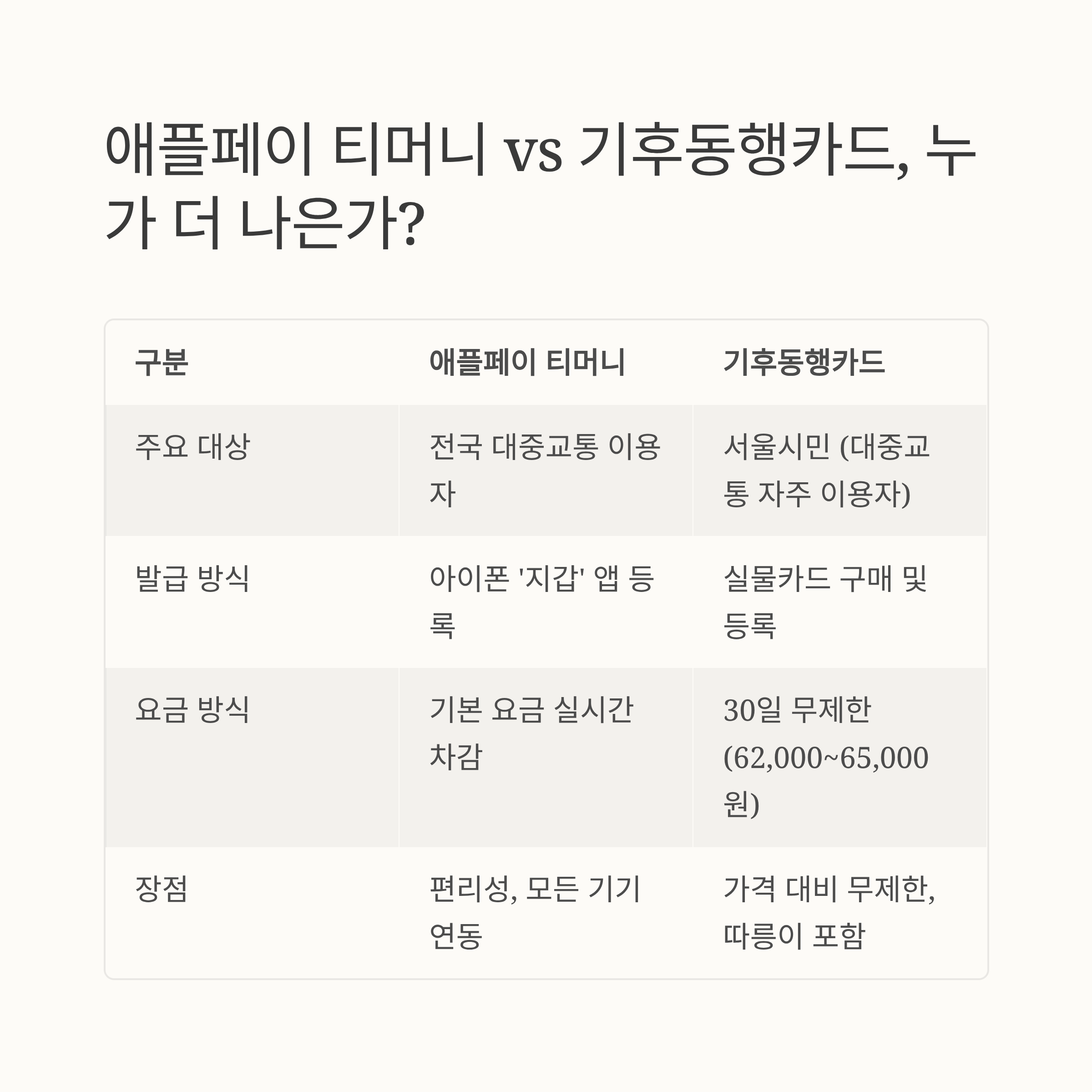 | 구분 | 애플페이 티머니 | 기후동행카드 |