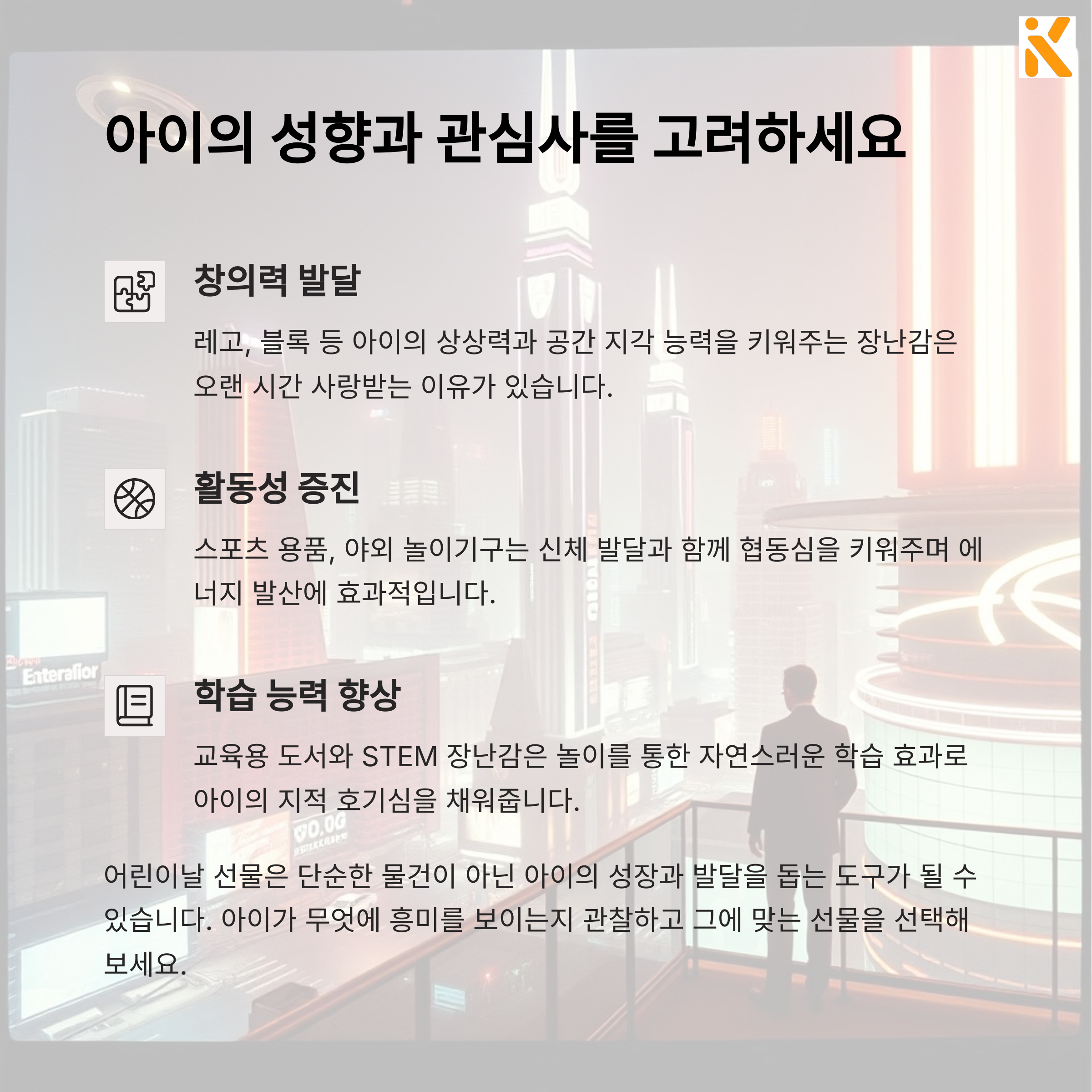 어린이날 선물을 고를 때는 아이의 성격과 관심사를 반드시 고려해야 합니다.