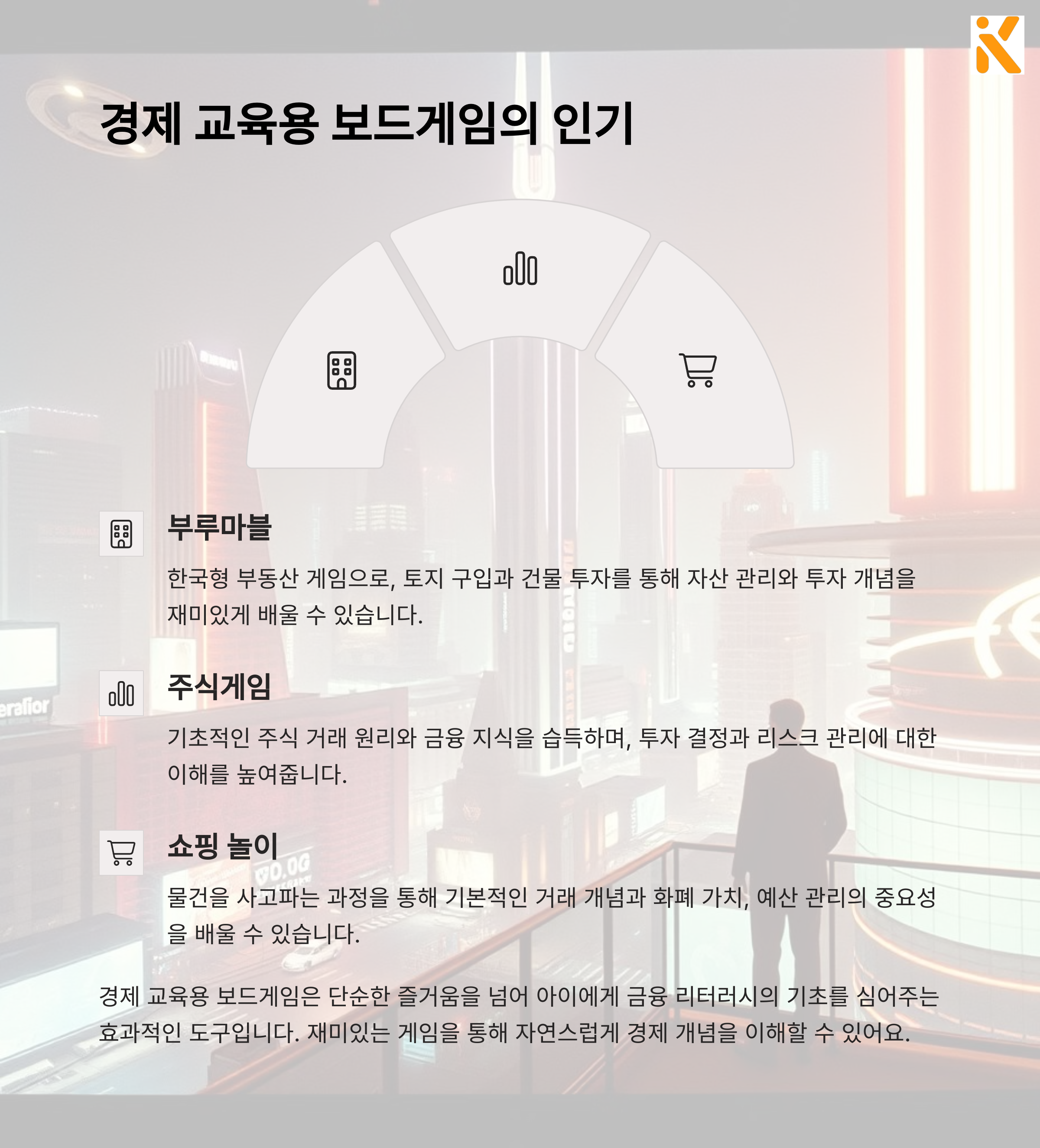 요즘은 경제 개념을 놀이로 가르칠 수 있는 어린이 전용 경제 보드게임이 인기를 끌고 있습니다. 예를 들어, 어린이용 '부루마블'과 같은 보드게임은 즐거움뿐 아니라 자연스럽게 경제 개념까지 배울 수 있어서 부모님들의 만족도도 높아요.