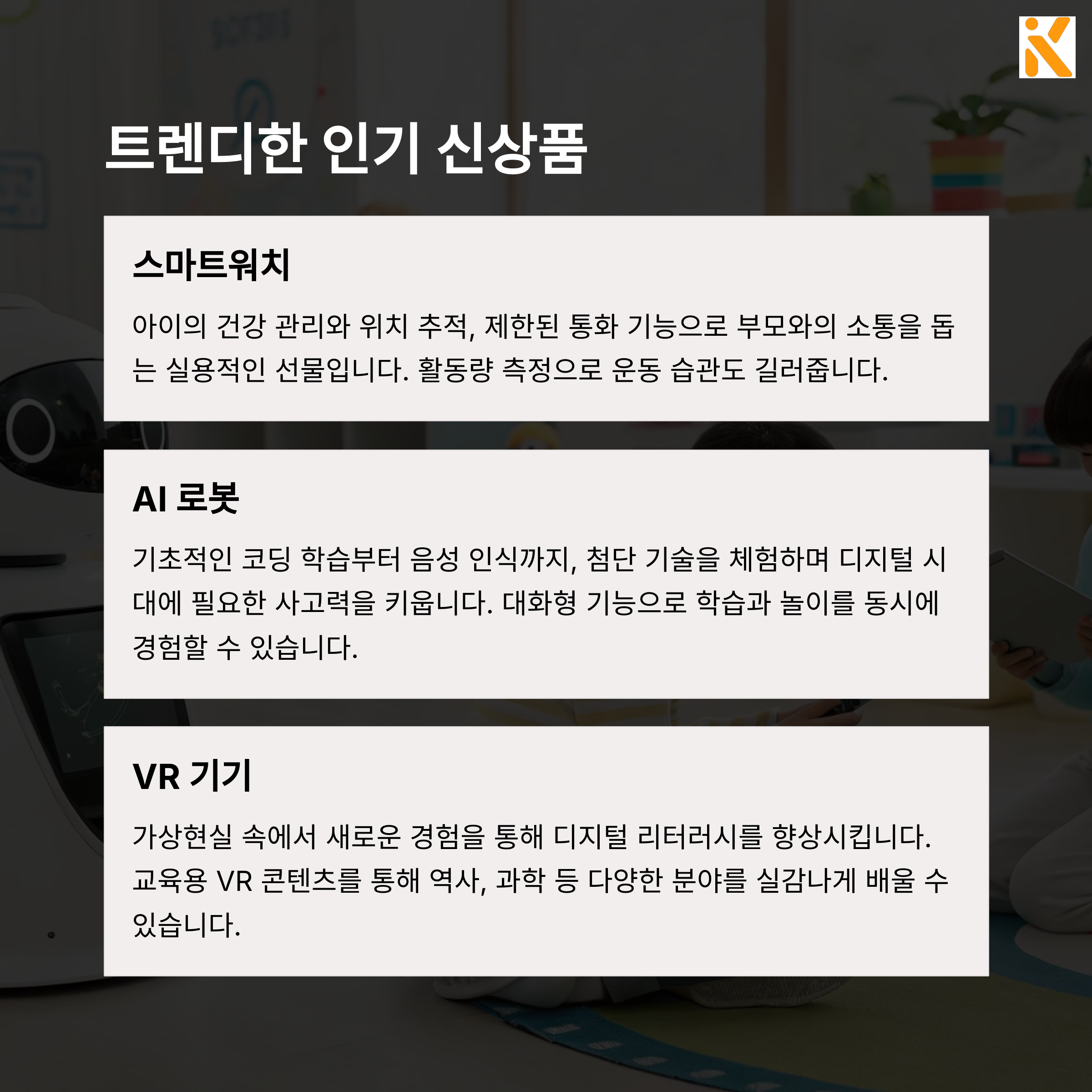 반대로 인기 신상품은 최신 트렌드를 반영한 제품이에요. 최근 주목받는 신상품에는 AI 로봇 장난감, 스마트워치, 포켓몬 굿즈 등이 있습니다. 이런 제품들은 요즘 아이들이 친구들과 공유하며 소통할 수 있는 매력이 크죠.