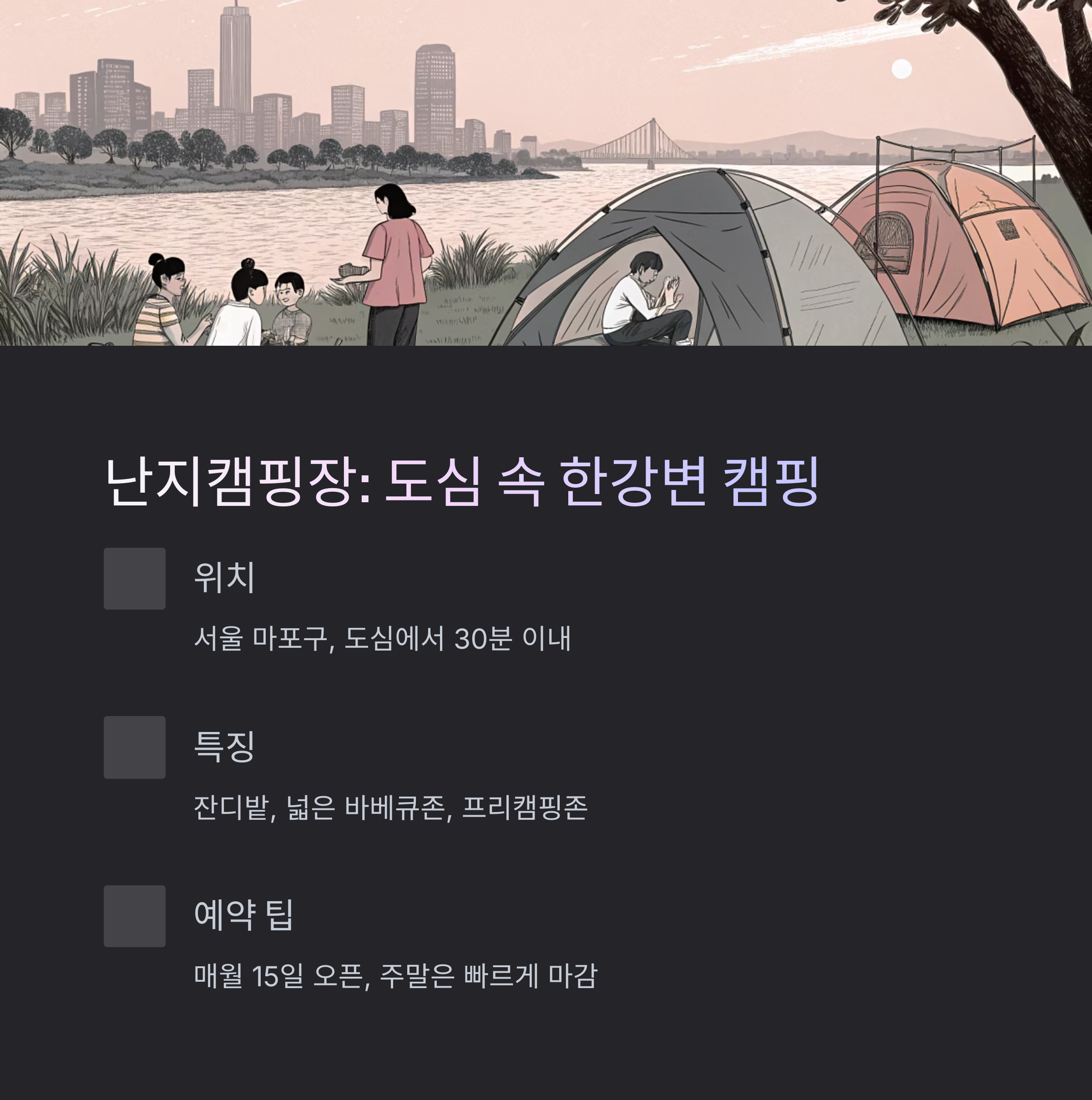 서울 마포구에 위치한 난지캠핑장은 서울 도심에서 불과 30분 이내 거리에 있는 한강변 캠핑장입니다. 잔디밭과 넓은 바베큐존,