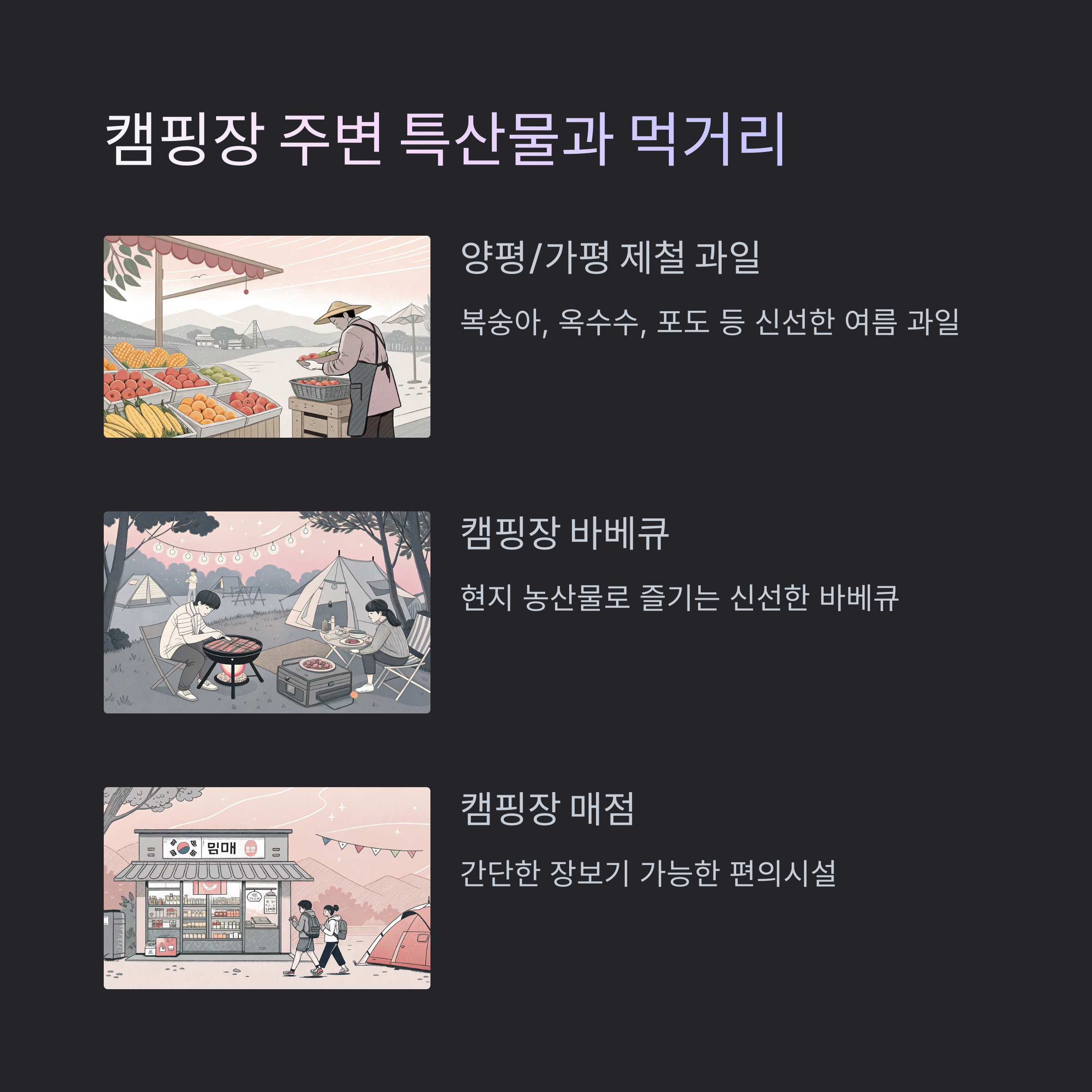 양평과 가평은 복숭아, 옥수수, 포도 등 여름 제철 과일의 본고장입니다. 캠핑장에서 직접 바베큐를 즐기려면