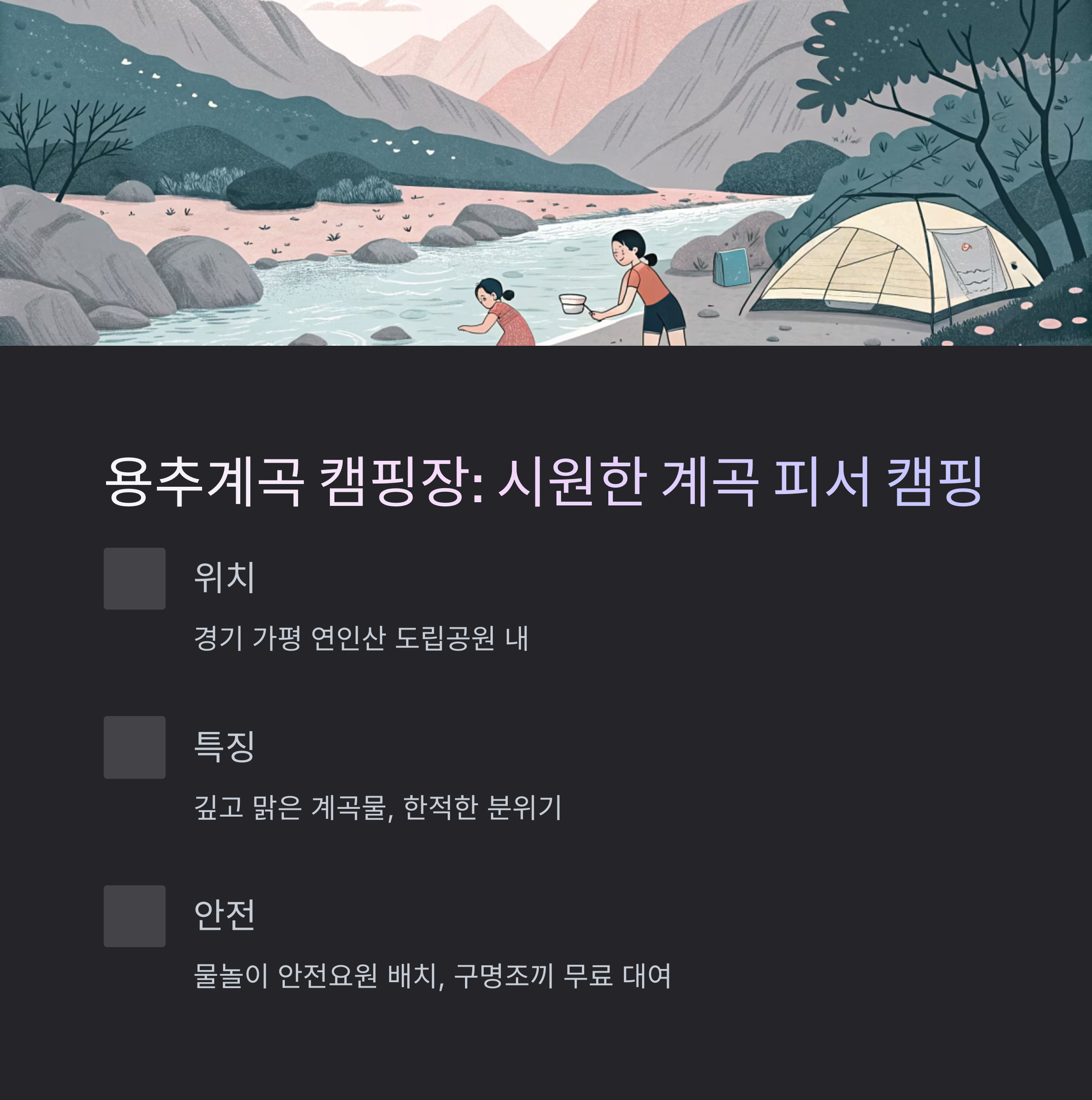 경기 가평에 위치한 이 캠핑장은 연인산 도립공원 내에 자리하고 있으며, 깊고 맑은 계곡물이 흐르는 한적한 장소입니다.