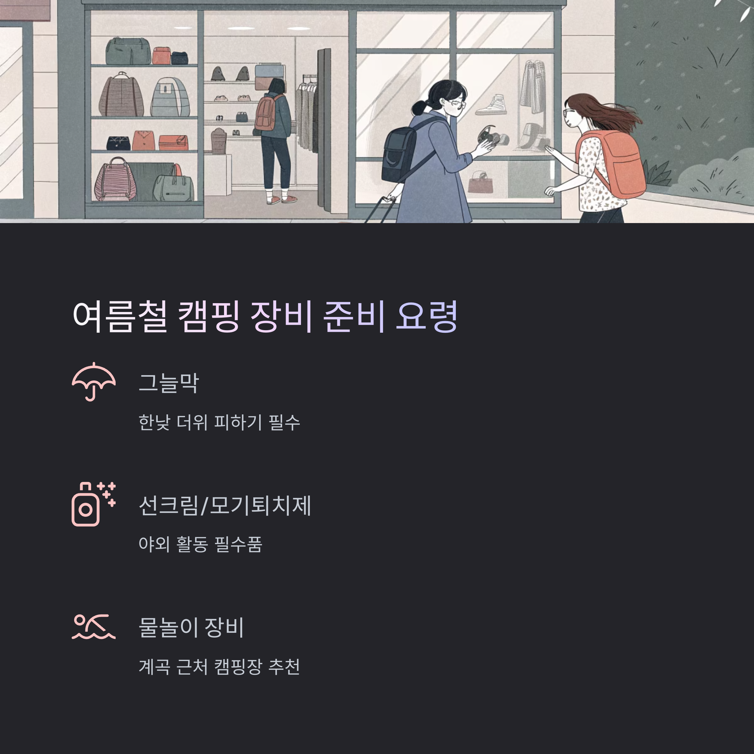 여름 캠핑의 가장 큰 매력은 물놀이와 강변 바람입니다. 그늘막, 선크림, 모기 퇴치제는 필수이며,