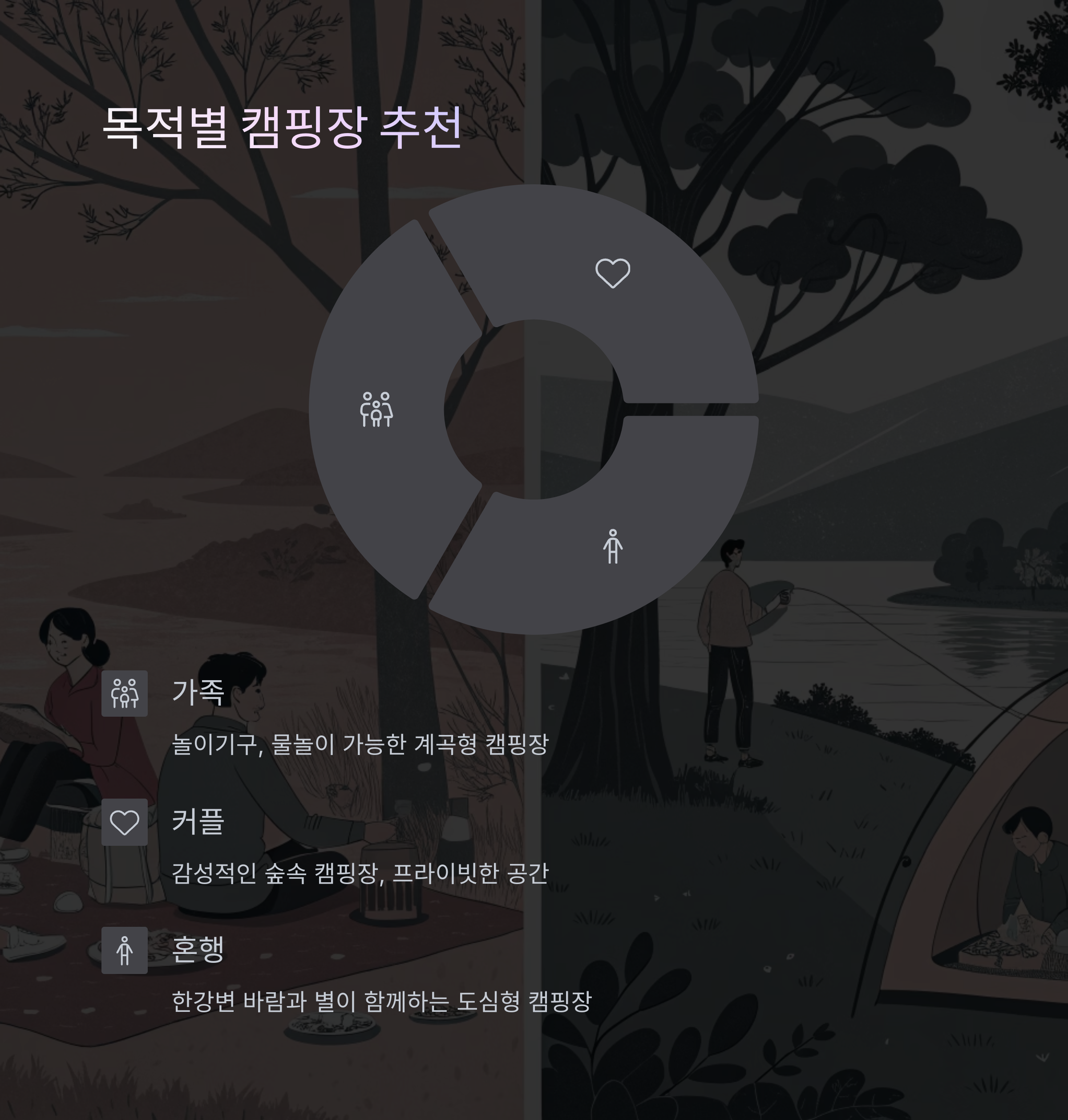 커플이라면 감성적인 숲속 캠핑장이 좋으며, 혼자만의 여정을 원한다면 한강변 바람과 별이 함께하는