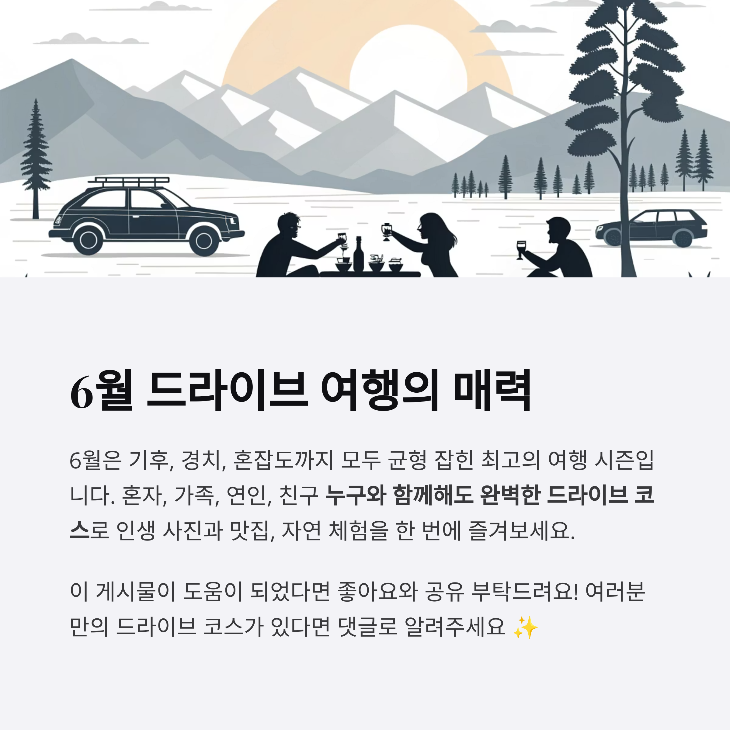 푸르른 자연과 따뜻한 햇살이 어우러진 6월, 가장 감성적인 드라이브 여행을 떠나기 좋은 시기입니다. 서울 근교는 물론 전국 각지의 명소까지, 여행 기간과 예산에 따라 최적의 코스를 안내해드립니다.