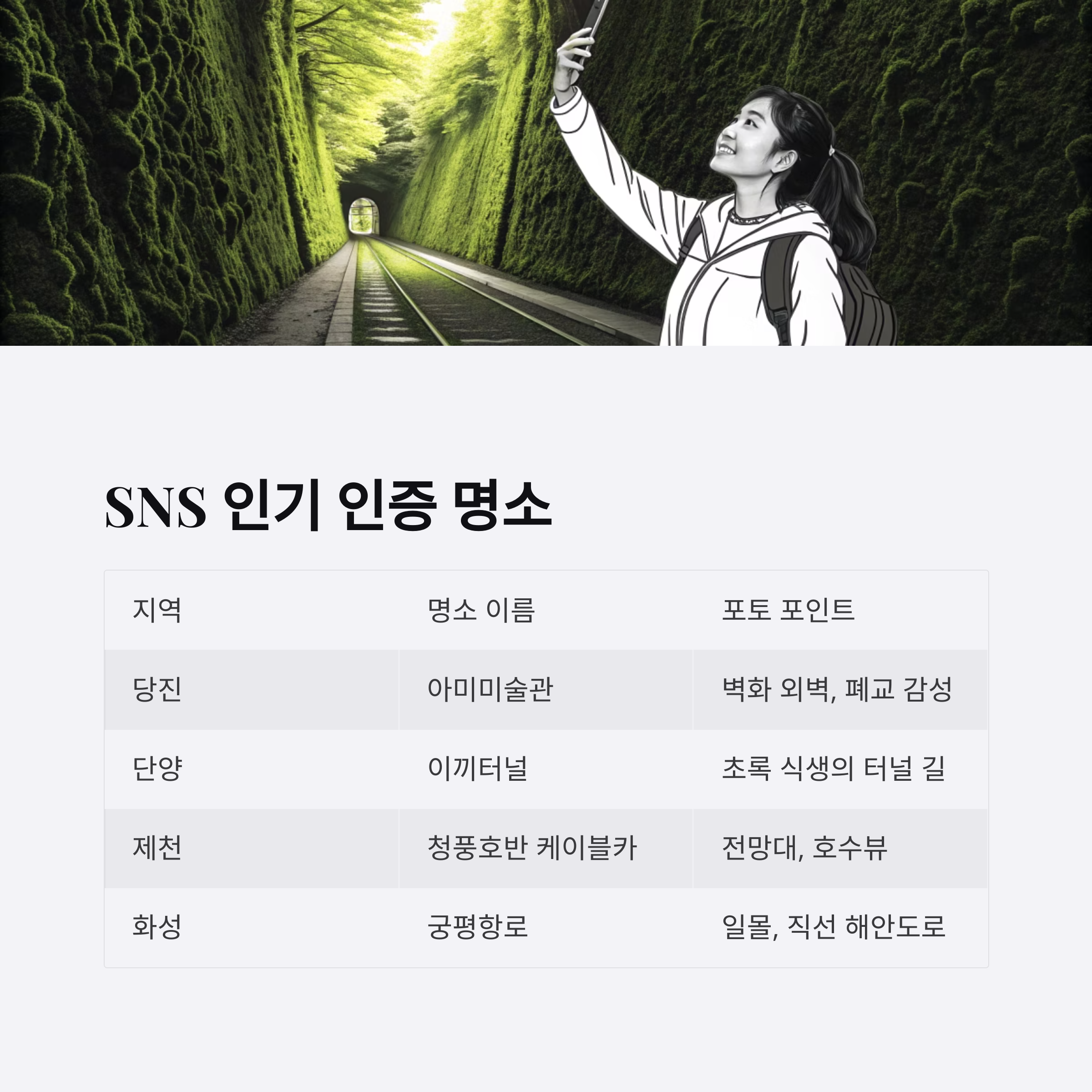 충청권에서는 당진 아미미술관, 제천 청풍호반 케이블카, 단양 이끼터널이 인기를 끌고 있습니다.