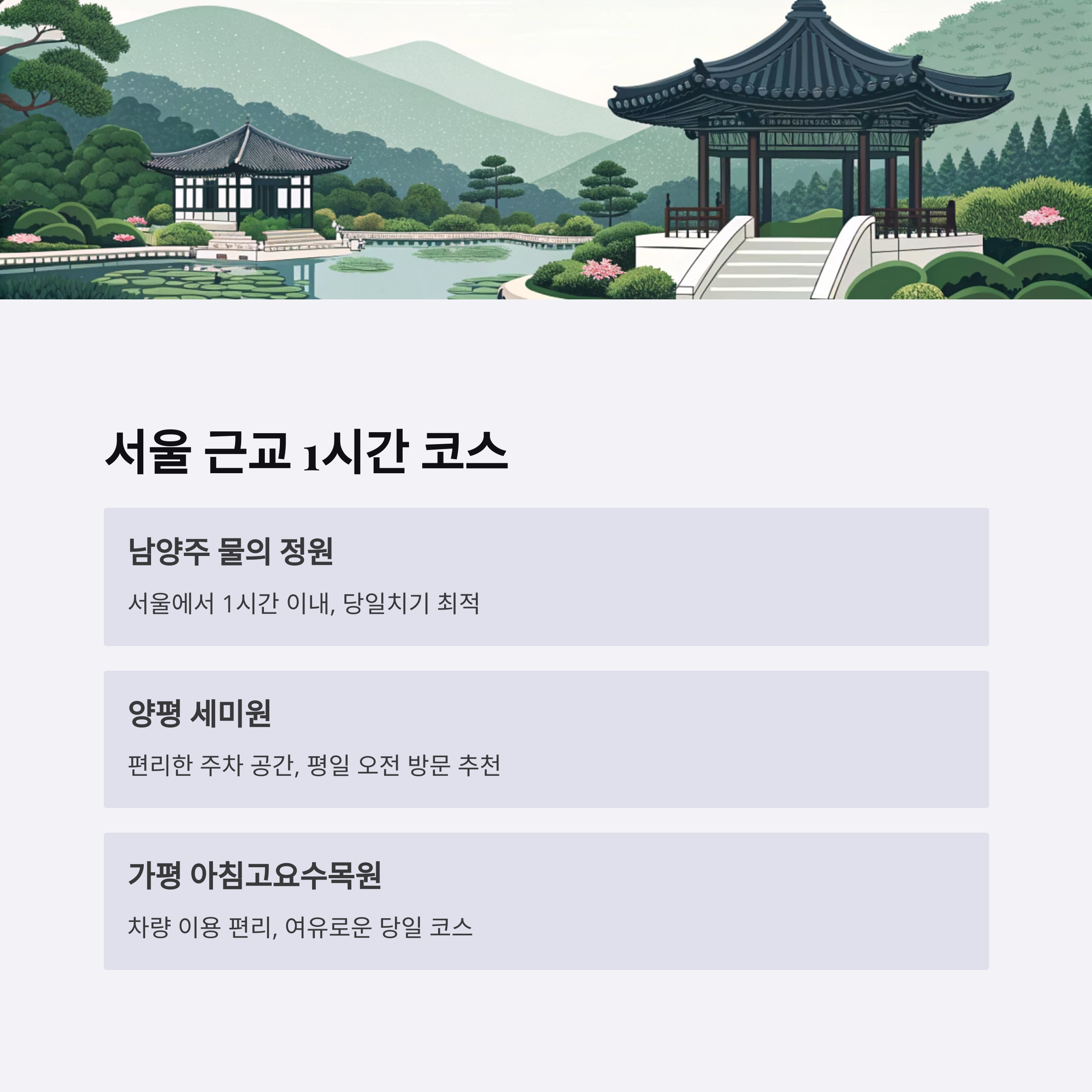 서울에서 출발해 1시간 안에 도착할 수 있는 코스는 남양주 물의 정원, 양평 세미원, 가평 아침고요수목원 등이 있습니다.