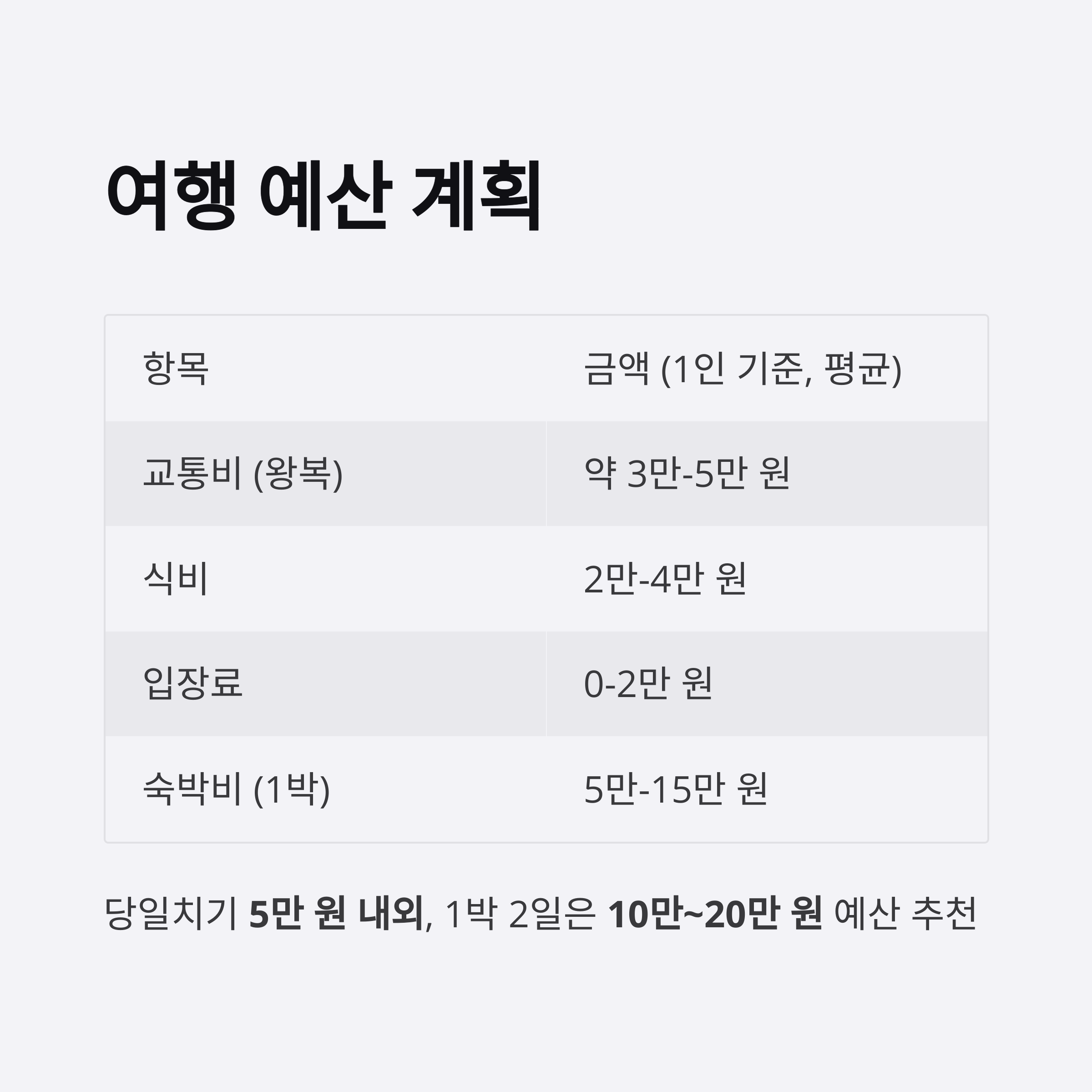 총 예산은 당일치기 기준 5만 원 내외, 1박 2일은 10만~20만 원 정도로 설정하면 무난합니다.