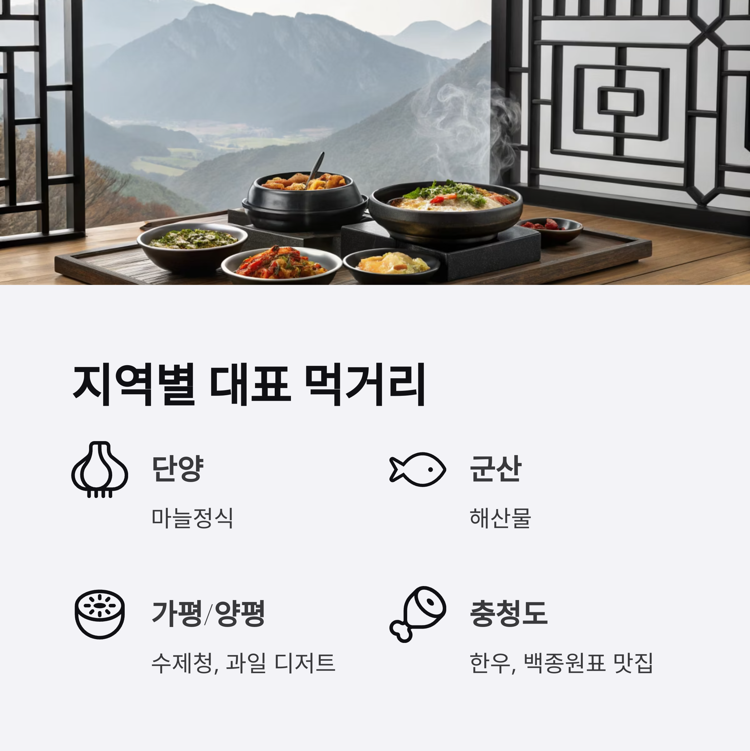 단양은 마늘정식, 군산은 해산물, 가평과 양평은 수제청과 과일 디저트로 유명하며