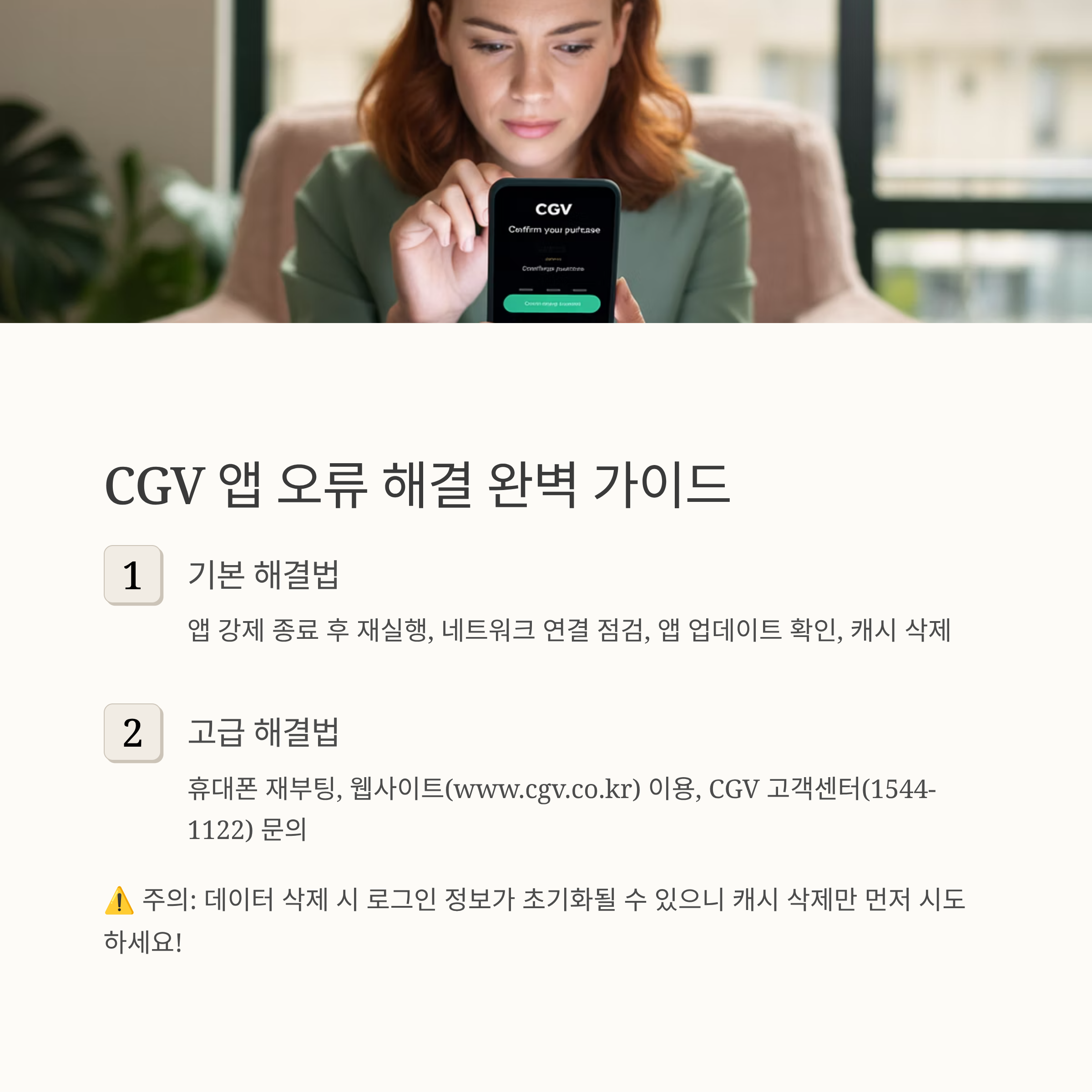 - 오류 발생 시 즉시 고객센터 연결: CGV 1544-1122 또는 웹사이트 고객문의 게시판으로 즉시 상담받는 게 가장 빠릅니다.
