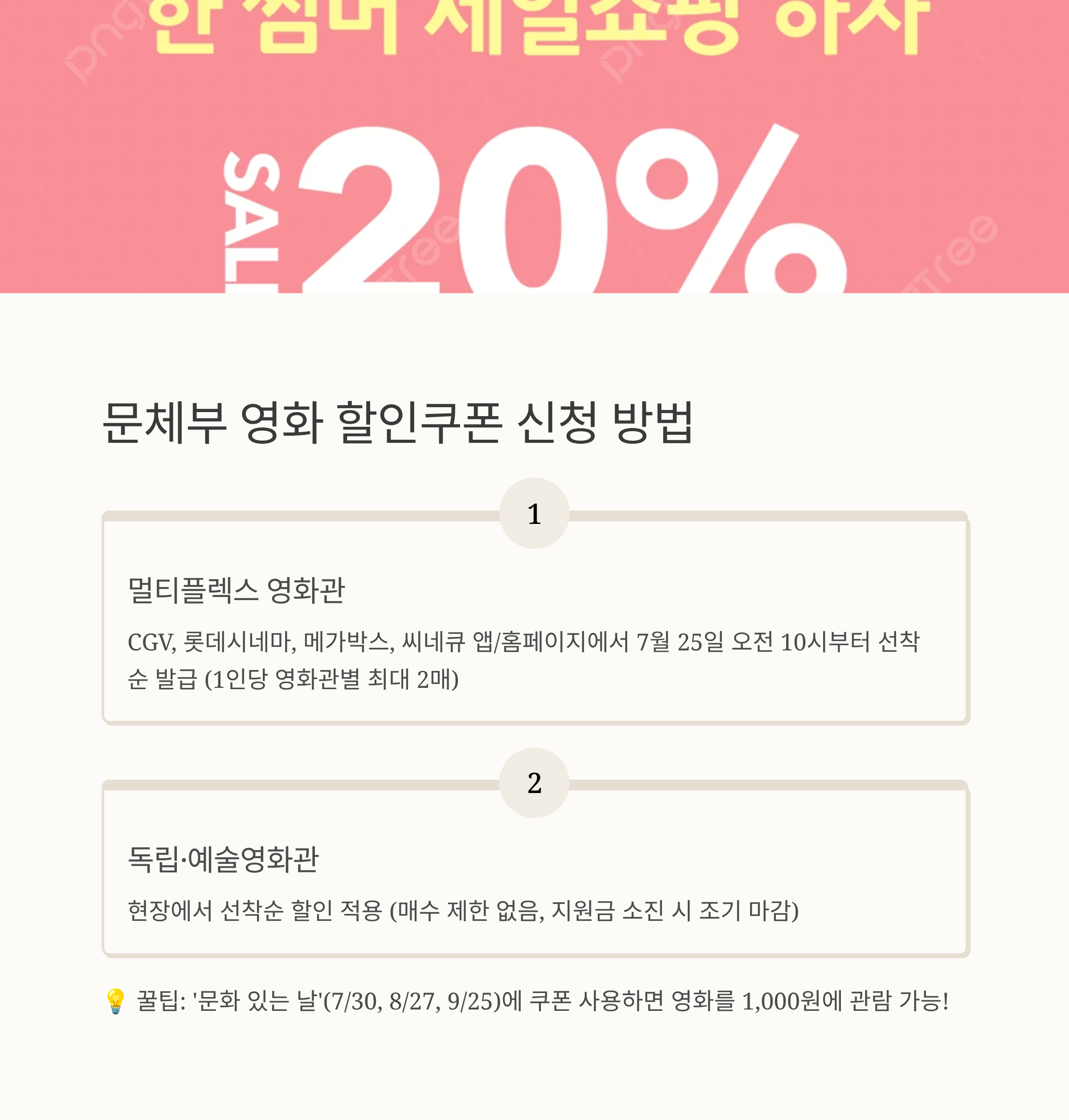 - 둘째, 할인쿠폰 발급 시작 시간인 7월 25일 오전 10시 정각부터 각 영화관 홈페이지 이벤트 페이지 또는 앱 내 배너 메뉴를 통해 선착순으로 받을 수 있어요. 이때, 서버가 터질 수 있으니 미리 준비하는 센스!
