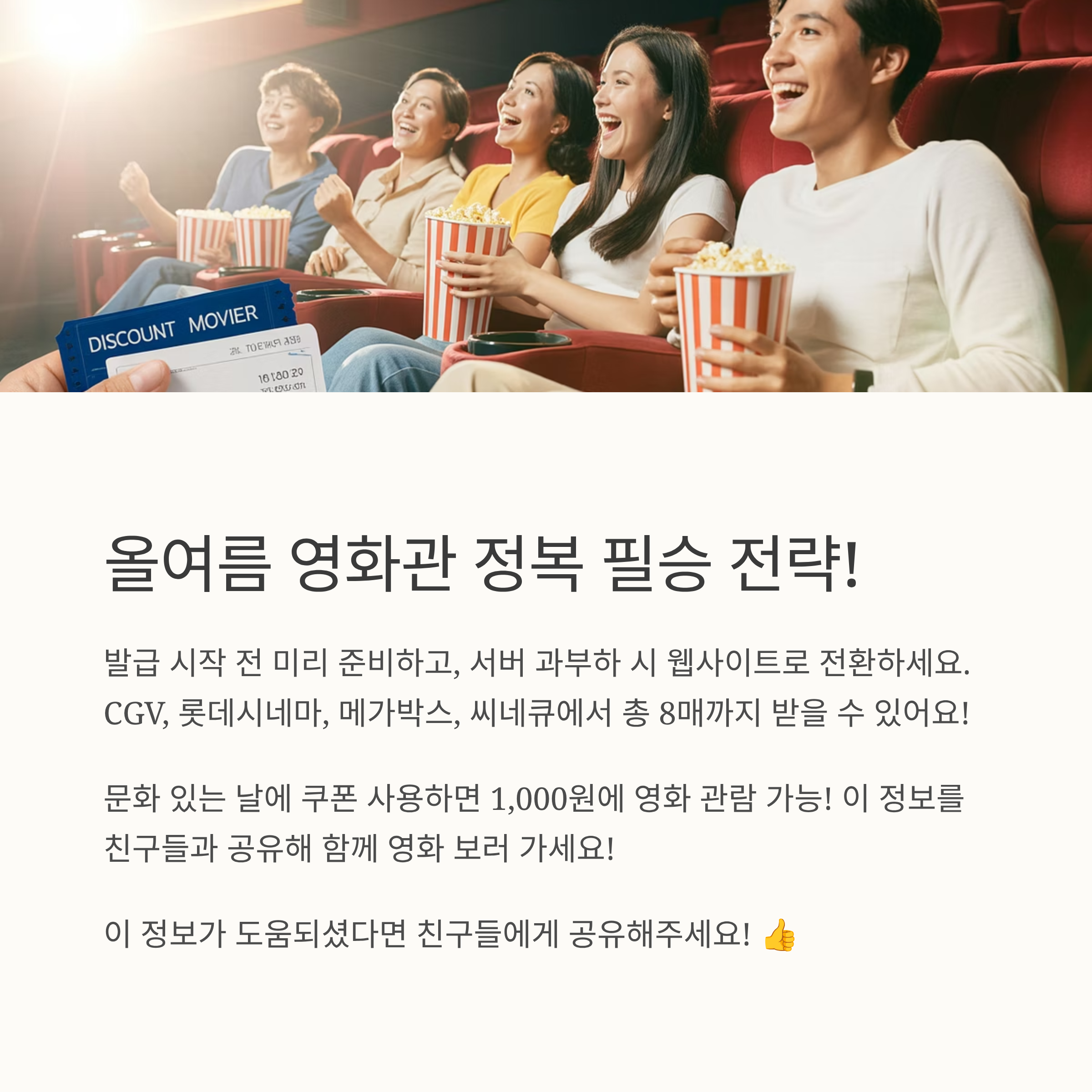 이 모든 정보를 실천한다면, 이번 여름 영화관을 아주 저렴하게, 여러 번, 그리고 스마트하게 즐길 수 있을 거예요. 쉽게 얻을 수 없는 할인 기회, 정말 놓치지 마시고요! 이번 여름, 시원하게 영화관에서 스트레스 푸시길 바래요! 😊