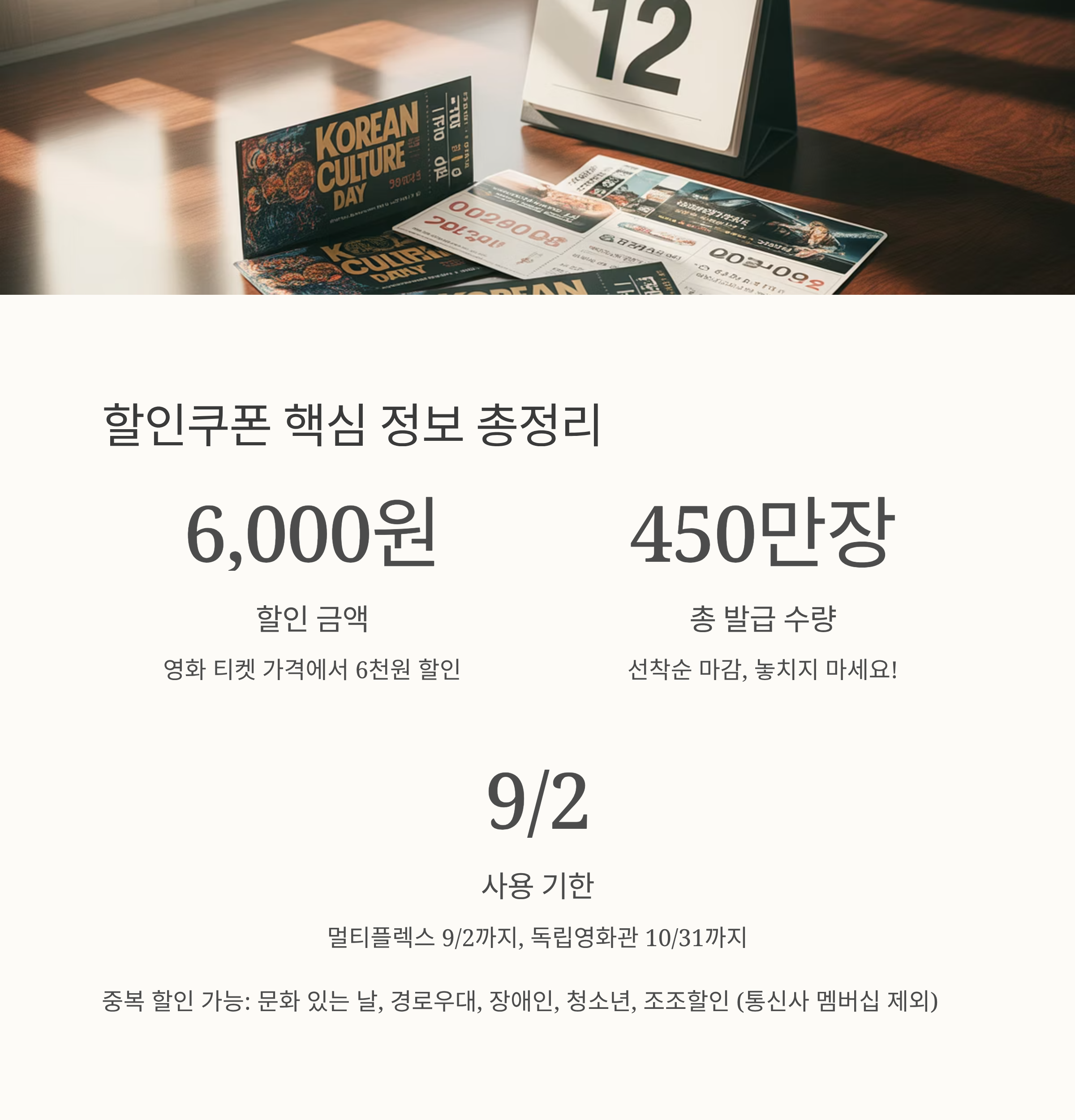 - 다섯째, 할인쿠폰은 9월 2일까지 사용할 수 있어요. 그리고 중요한 건, 중복 할인(문화 있는 날, 경로우대, 장애인, 청소년, 조조할인)도 가능하다는 점! 단, 통신사 멤버십 할인은 중복 적용이 안 되니 참고해 주세요.
