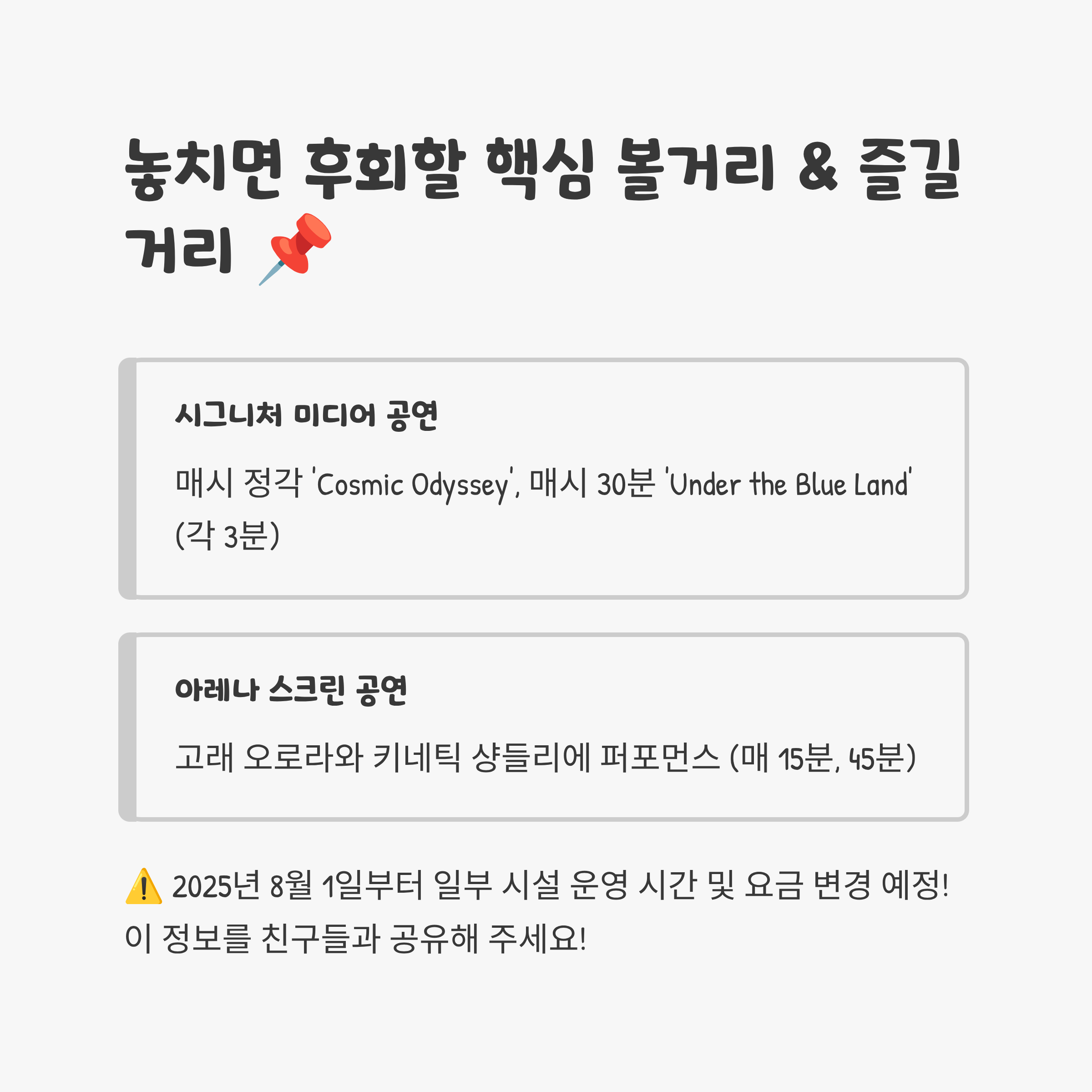 2025년 8월 1일부터 셰프스 키친과 일부 부대 시설의 운영 시간 및 요금이 변경될 예정이라고 합니다. 방문 전 반드시 공식 홈페이지에서 최신 정보를 확인하는 것이 필수입니다.