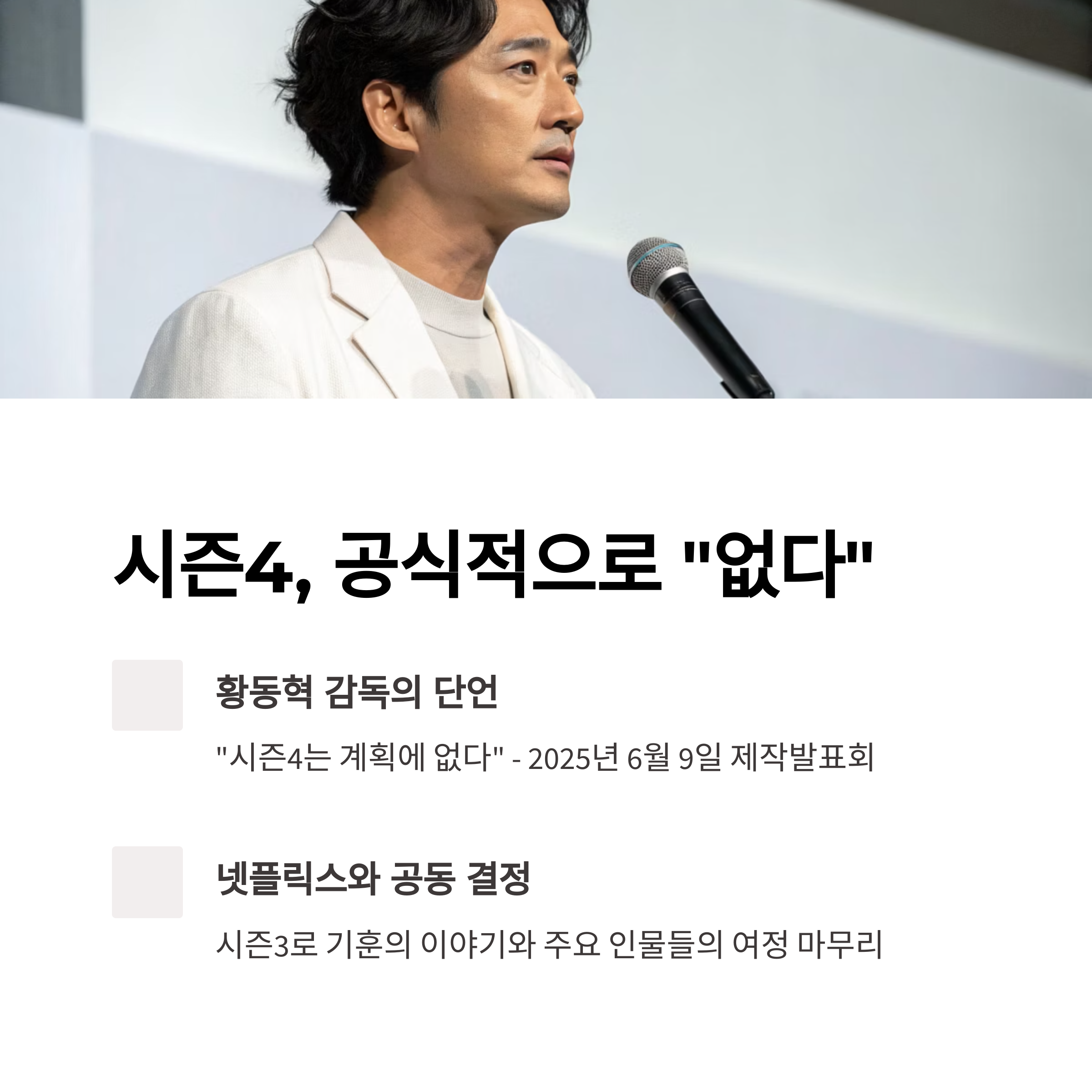 2025년 6월 9일 열린 제작발표회에서 황동혁 감독은 "시즌4는 계획에 없다"고 단언했습니다.
