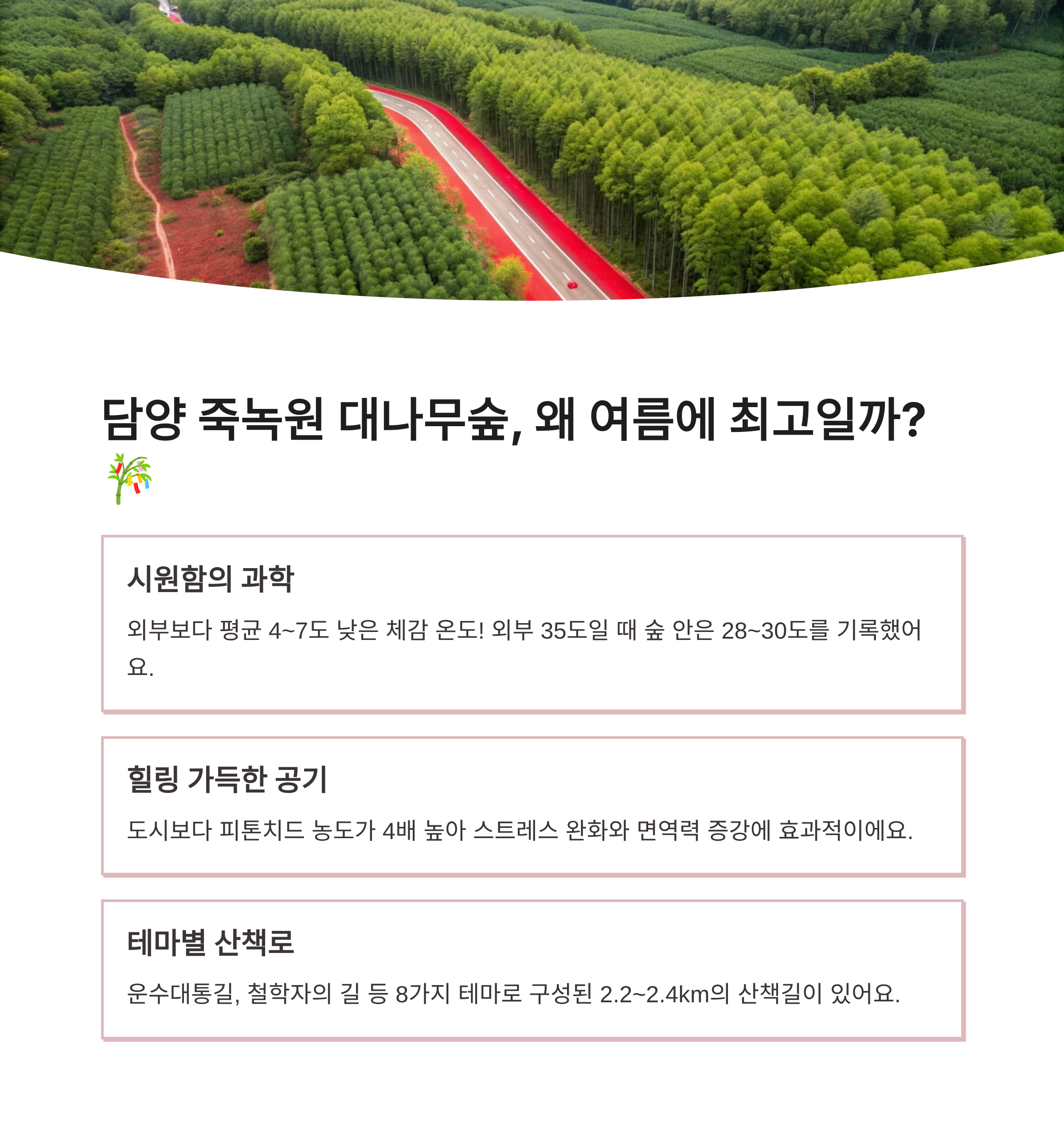 담양 죽녹원 대나무숲은 단순히 풍경이 아름다운 곳을 넘어, 지친 몸과 마음에 진정한 휴식을 선물해주는 곳이에요. 올여름, 시원하고 청량한 대나무숲에서 잊지 못할 힐링의 시간을 보내보는 건 어떨까요? 😊