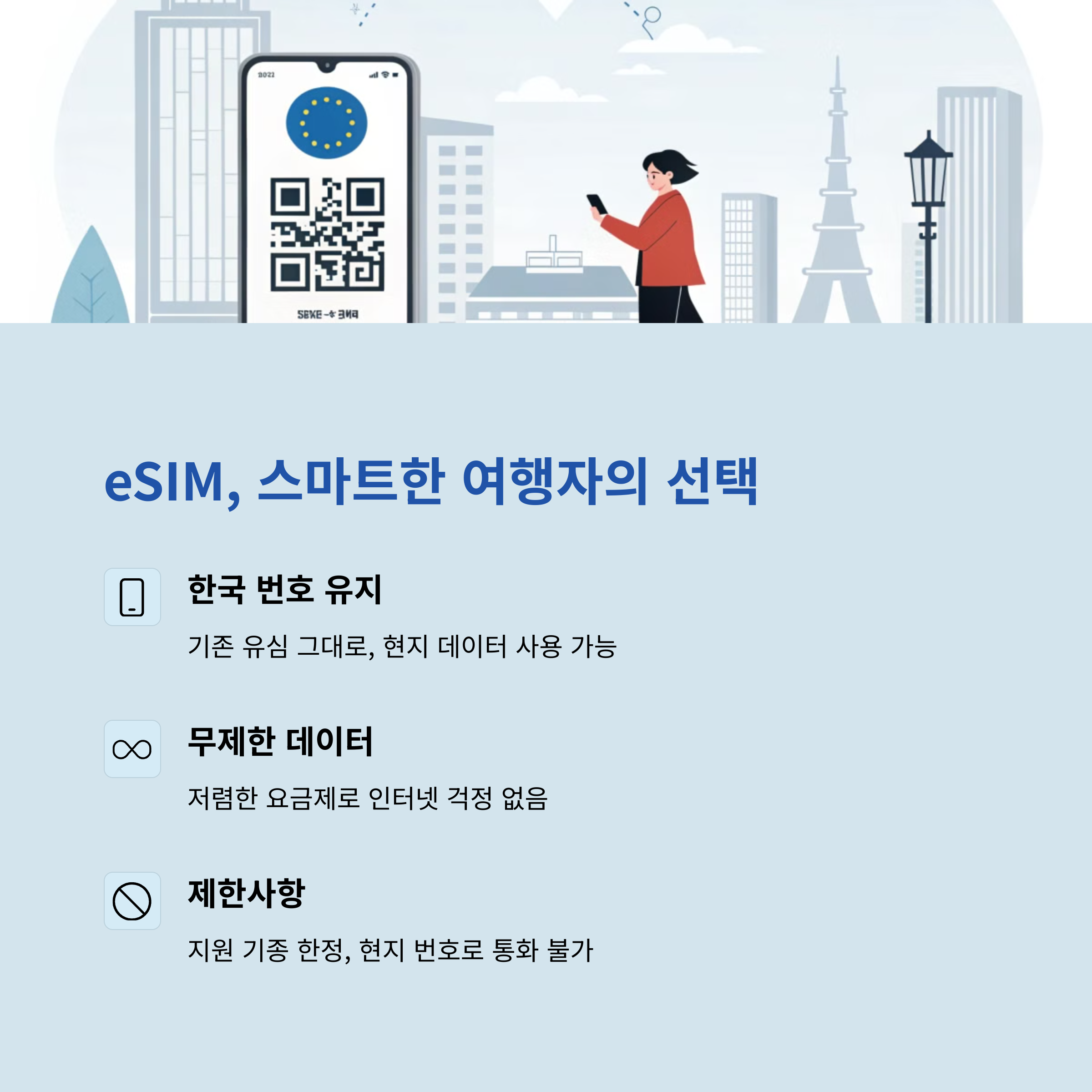 | eSIM | 기존 유심을 교체하지 않고 사용할 수 있으며, 한국 번호를 유지하면서 현지 데이터를 사용할 수 있습니다. |