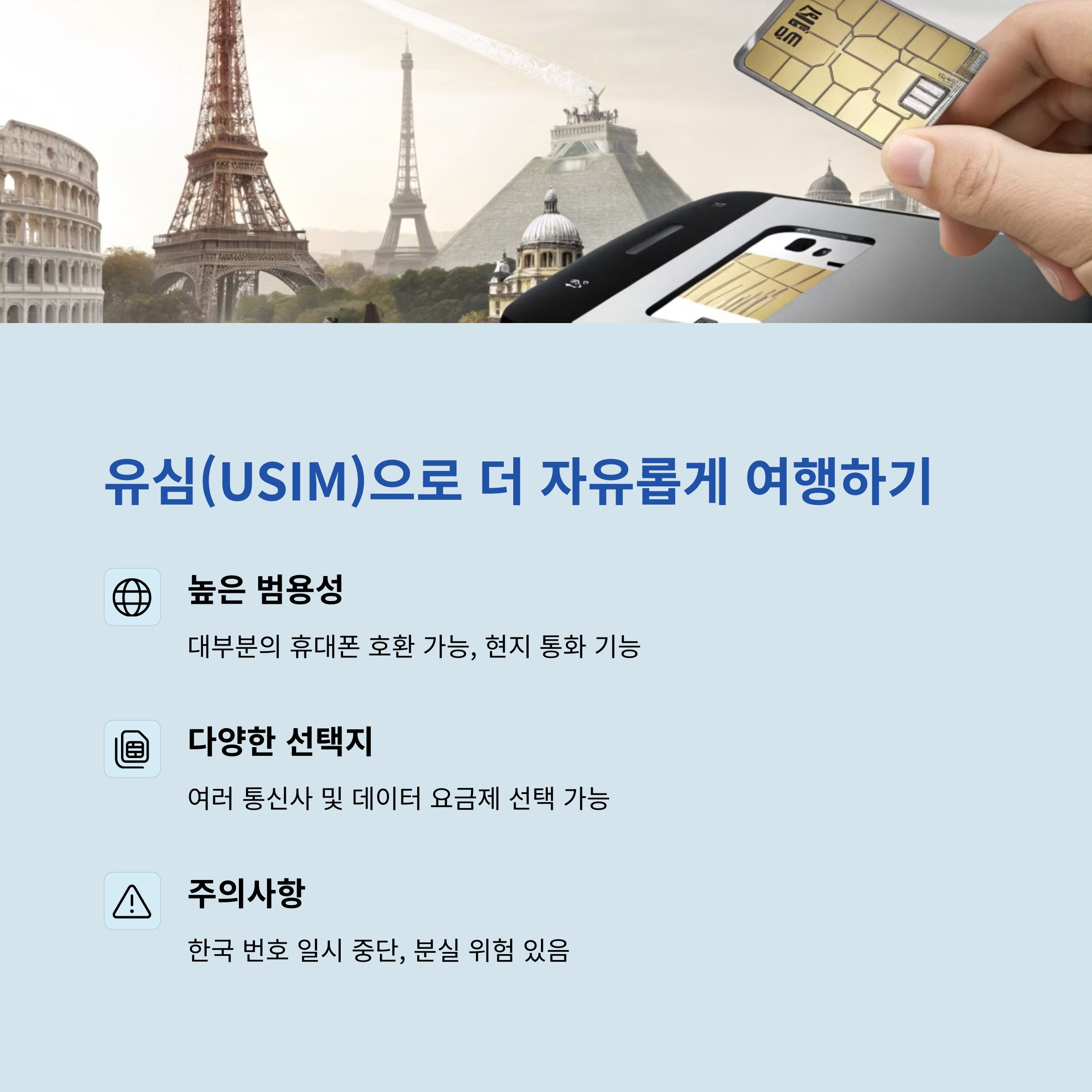 | 유심 | 범용성이 높고, 대부분의 휴대폰에서 사용 가능합니다. |