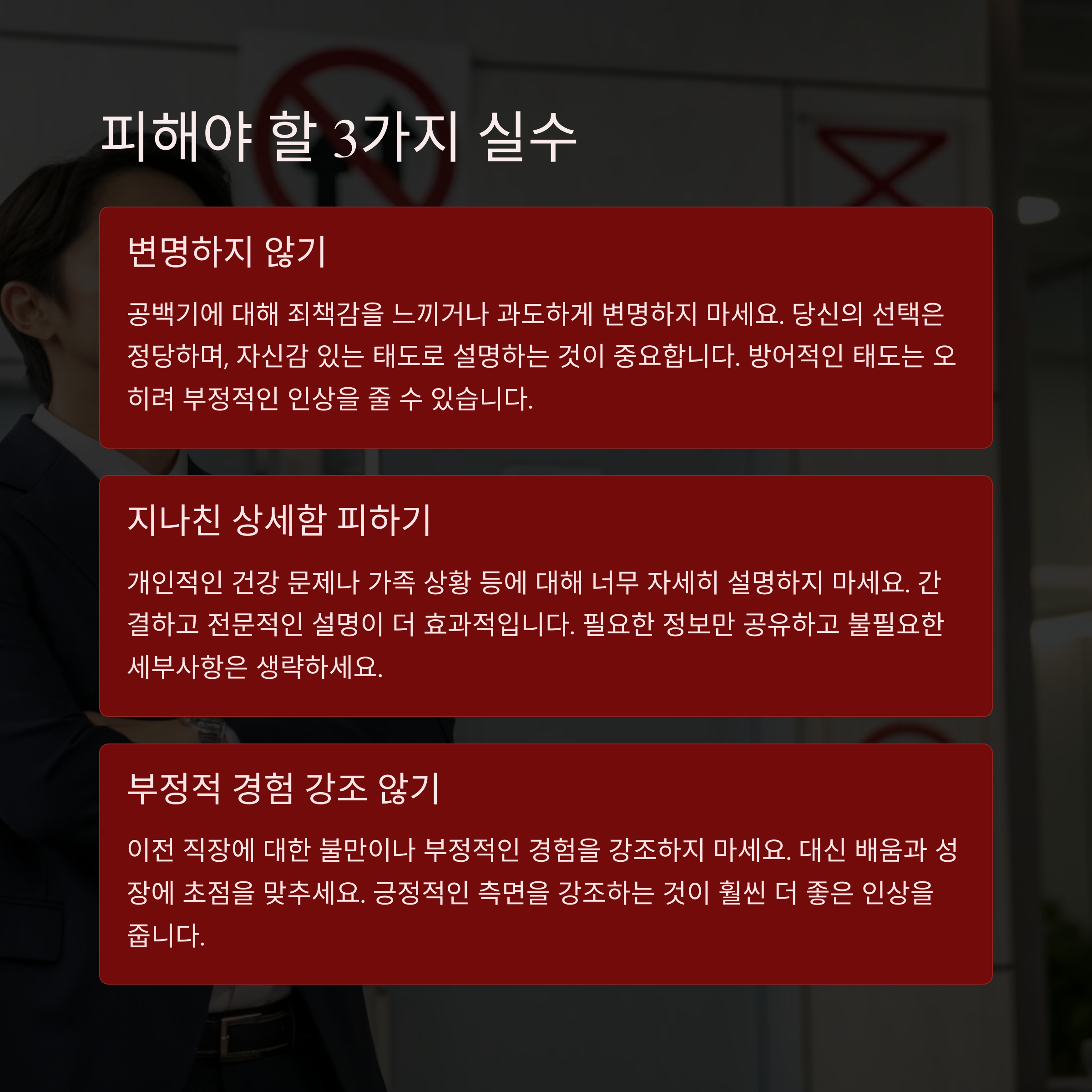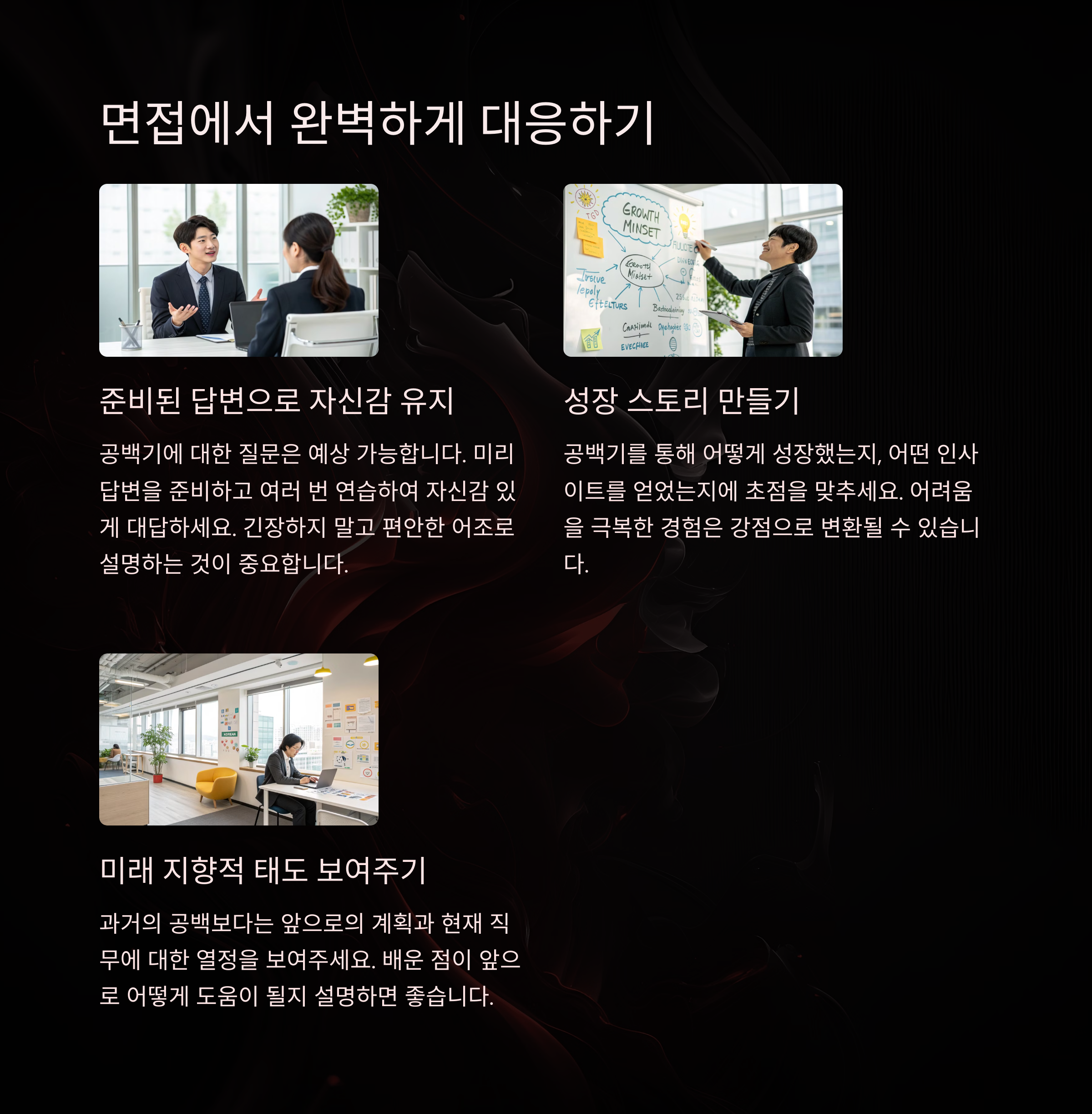 - 자신감 있게 대응하기: 공백기를 부끄러워하거나 변명하려 들지 마세요. 대신 그 기간을 통해 얻은 것들에 대해 자신감 있게 이야기하세요.