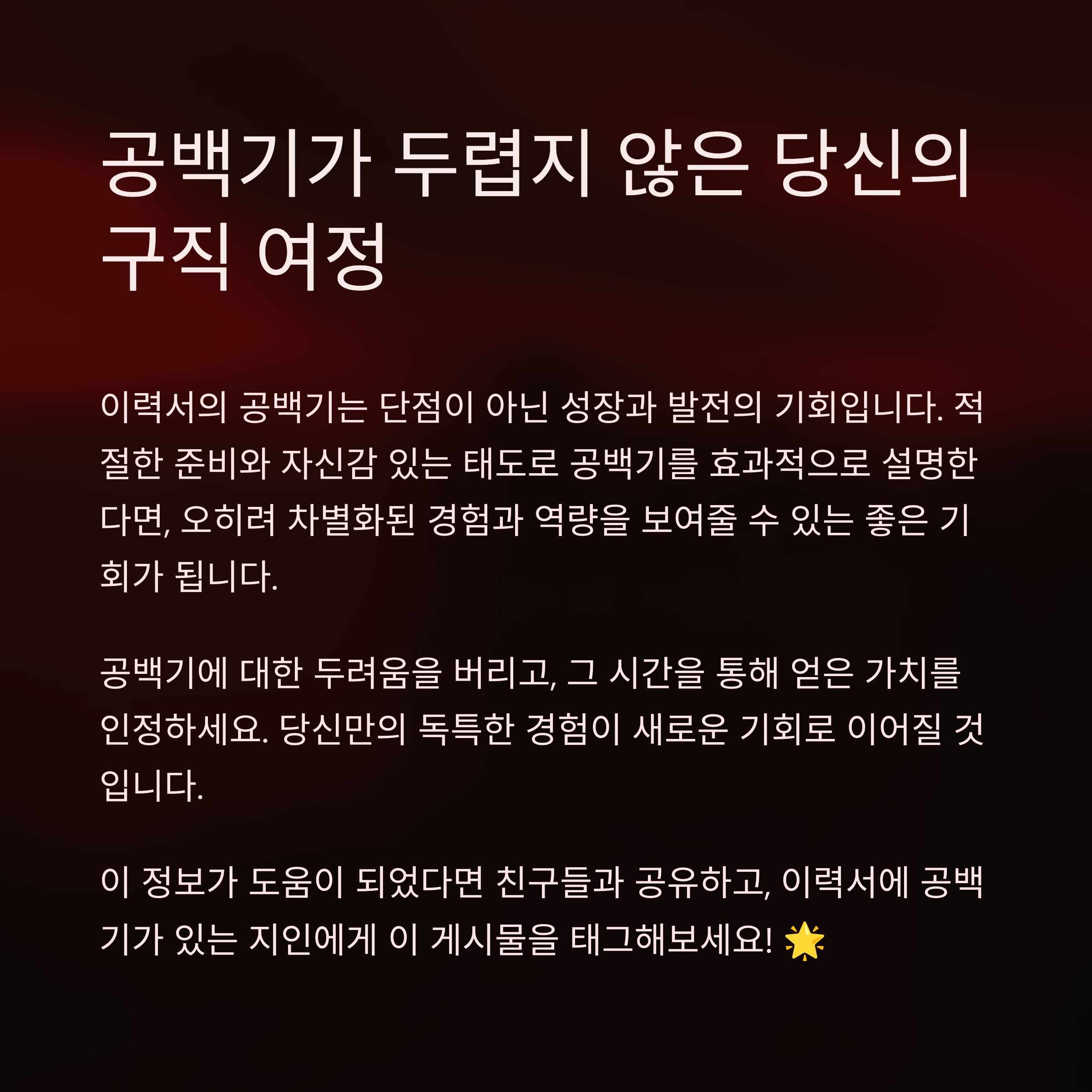 - 간결하게 설명하기: 공백기에 대해 너무 길게 설명하지 마세요. 핵심만 간결하게 언급하고, 대신 여러분의 능력과 성과에 더 많은 지면을 할애하세요.