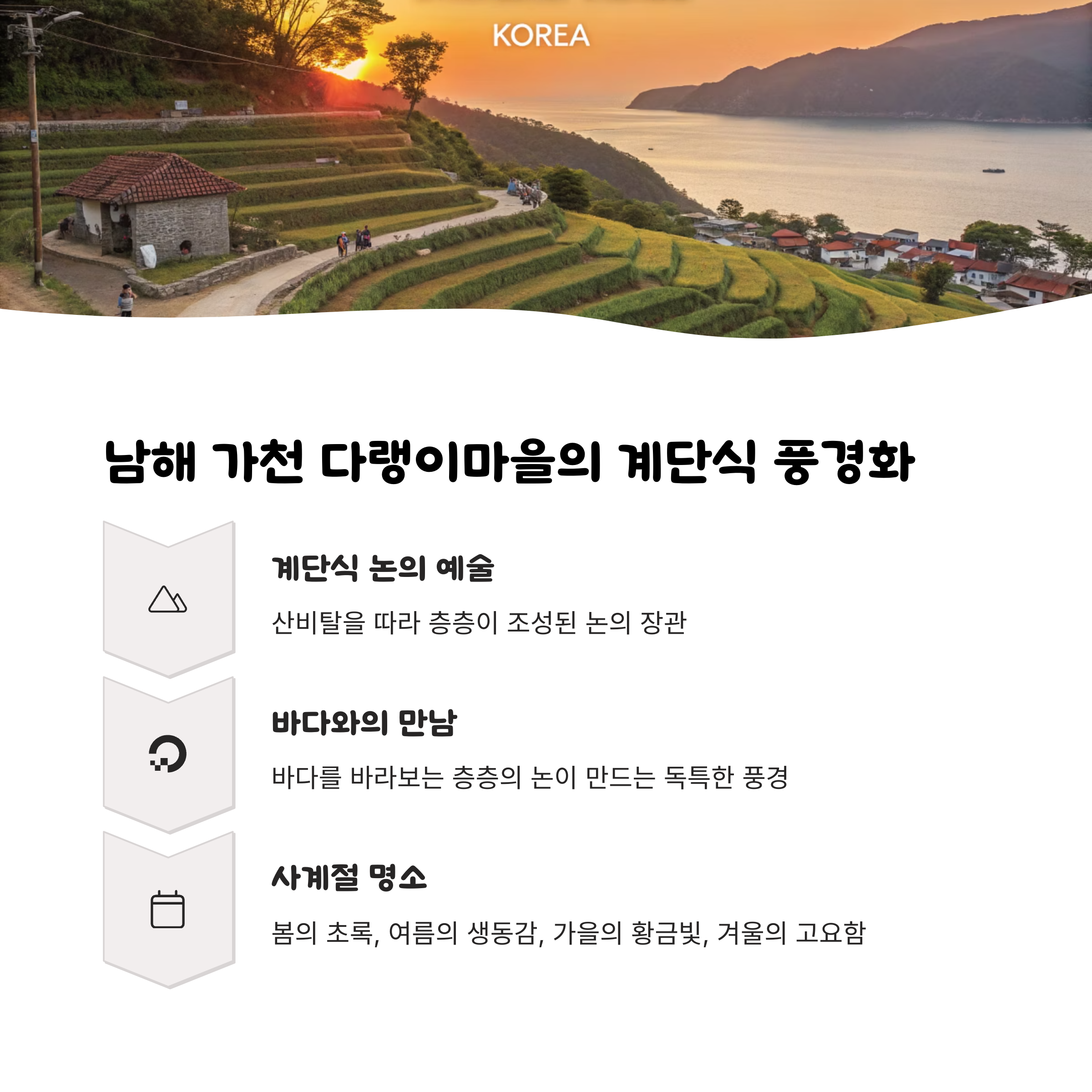 전통적인 다랭이 논이 펼쳐진 이곳은 자연과 인간이 함께 만들어낸 예술작품 같아요.