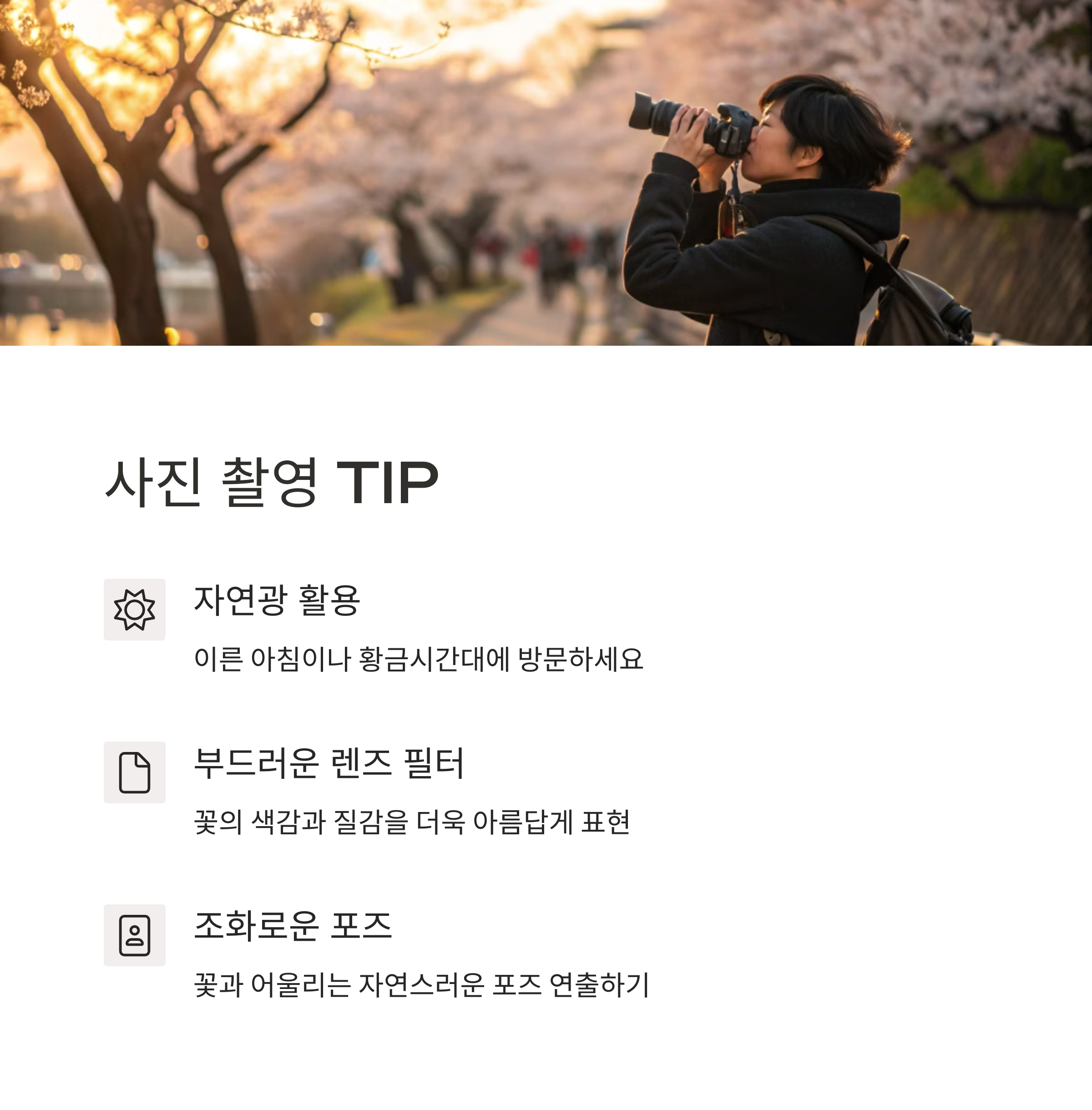 주말이나 공휴일은 인기 있는 꽃 명소가 매우 혼잡할 수 있습니다. 가능하다면 평일 이른 아침에 방문하여 더 여유롭게 사진을 찍고 꽃을 감상해보세요. 특히 진해 군항제나 여의도 벚꽃 축제처럼 인기 있는 장소는 사진작가들로 항상 붐비니 참고하세요.
