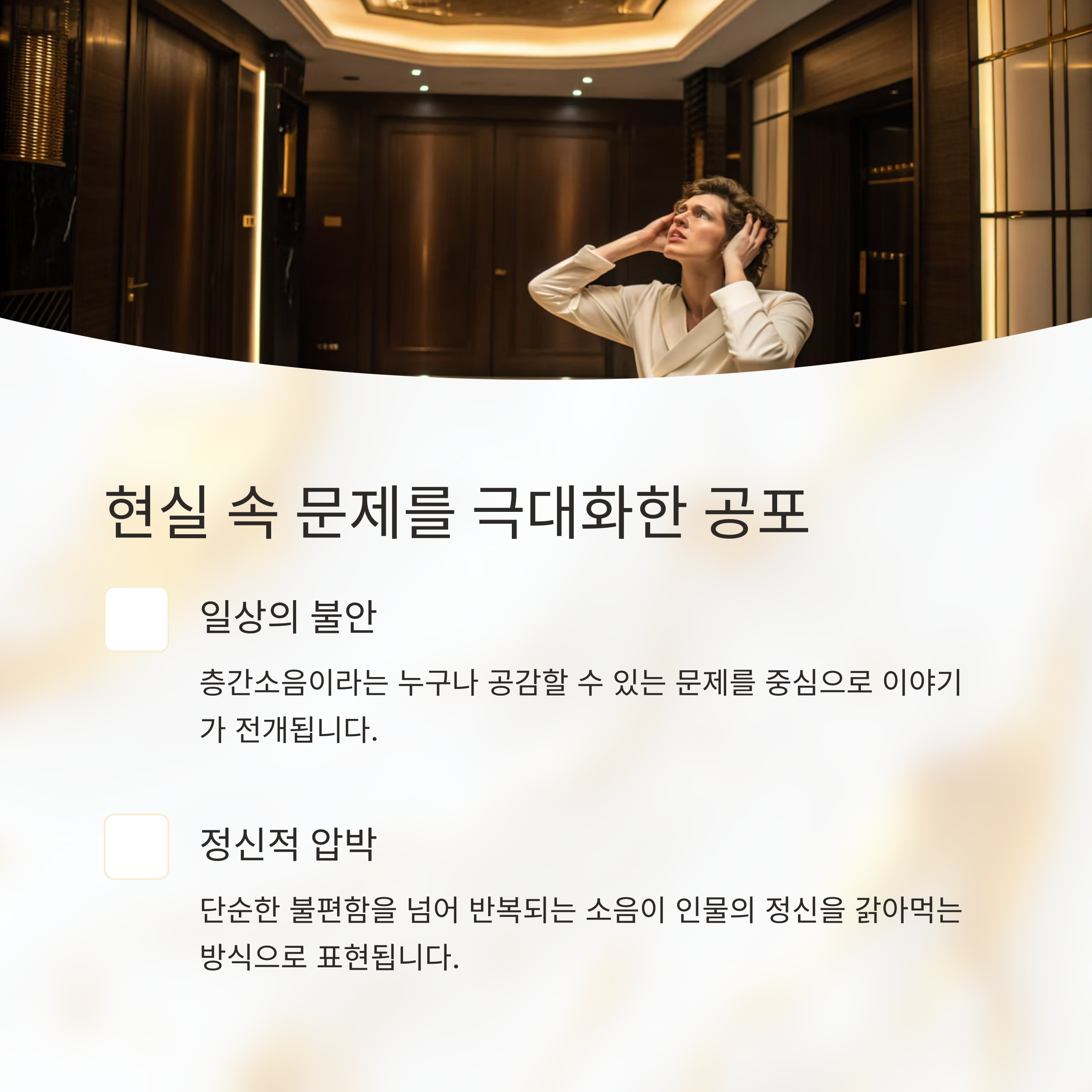 극장 속 이야기처럼 들리지만, 우리가 사는 집 바로 위에서 일어날 수도 있는 일이라는 점이 심리적 공포를