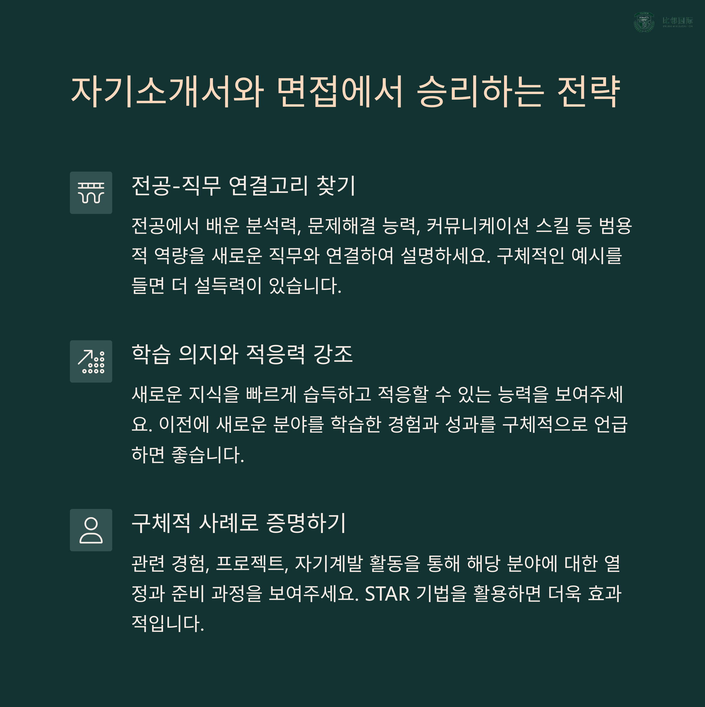 전공이 다르다는 것은 약점이 아닌 강점이 될 수 있습니다. 한 취업 성공 사례를 보면, "취업시장에서 제가 가진 약점(전공)을 강점으로 전환하는 것"이 핵심이었습니다. 직무에는 적용하기 어렵지만, "업종을 전공 관련 업종 회사로 타겟팅"하는 전략을 사용했습니다.