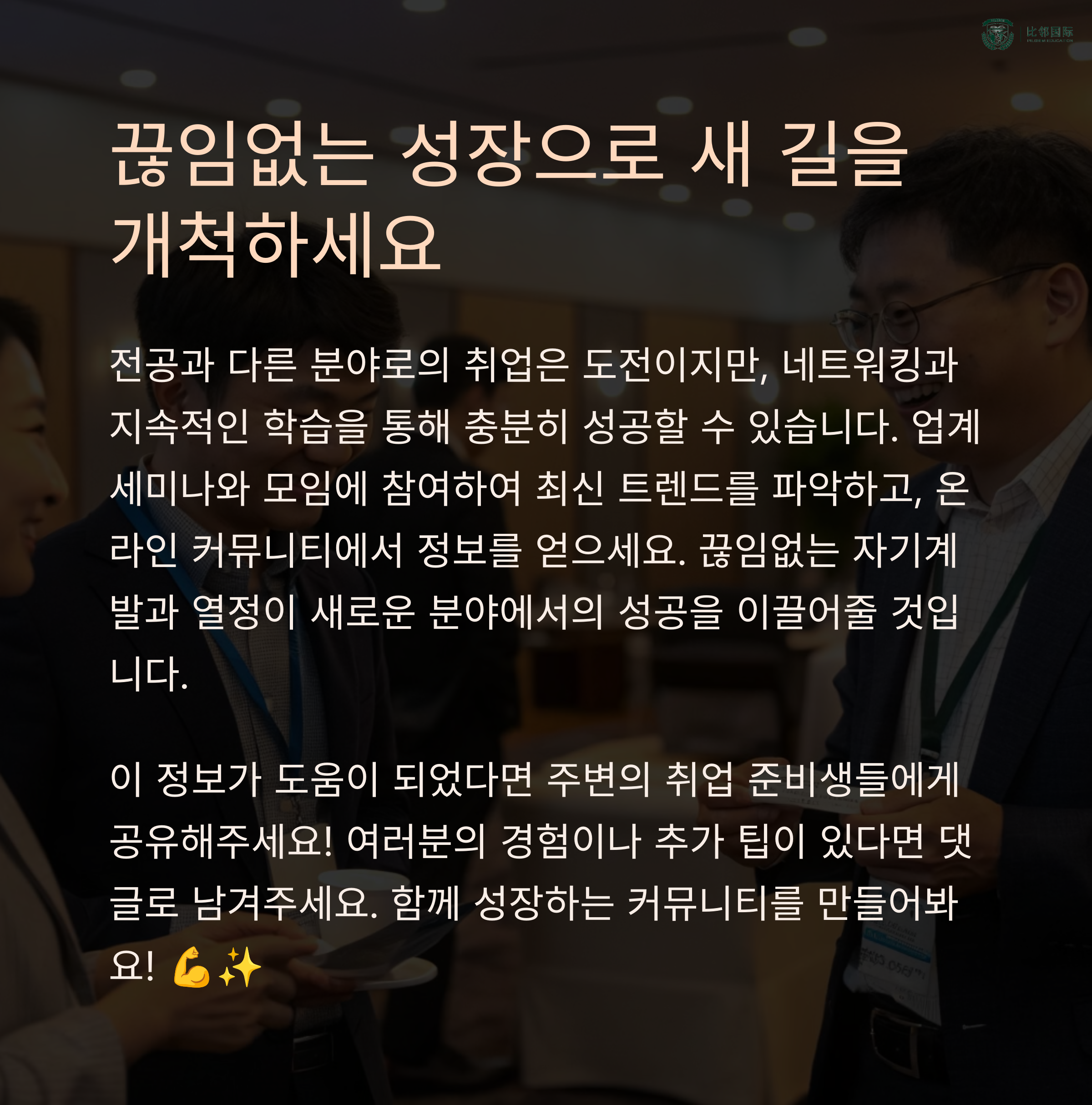 전공과 다른 분야로의 취업은 도전적인 과정이지만, 충분히 가능합니다. 약점을 강점으로 바꾸고, 관련 경험을 쌓고, 전략적으로 접근한다면 성공적인 직무 전환을 이룰 수 있습니다.