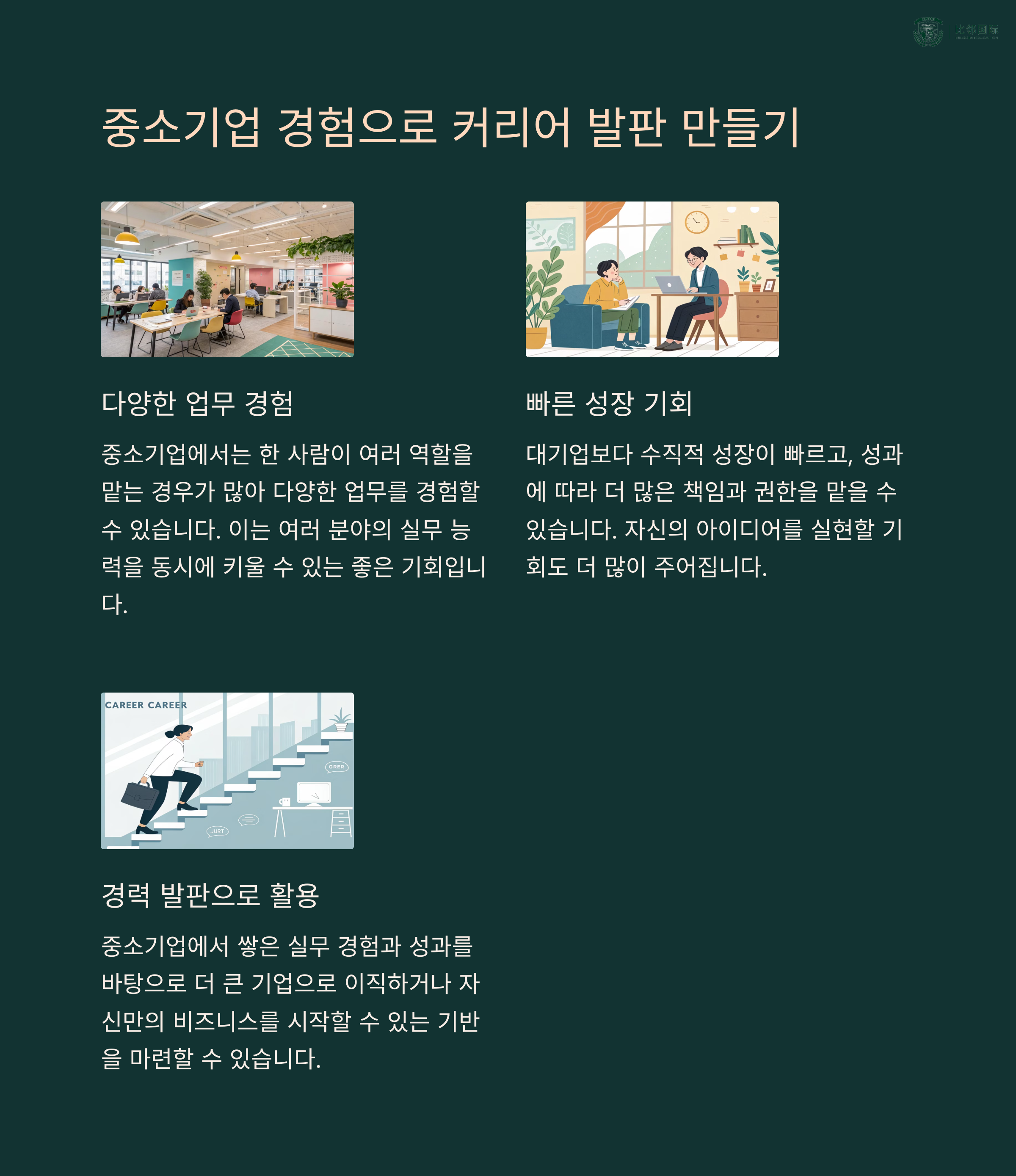 중소기업은 다양한 업무를 경험할 수 있는 기회가 많습니다. 본인의 적성을 찾는 과정에 있어 매우 유익하며, 2~3년 후 대기업이나 공공기관 이직도 가능합니다.