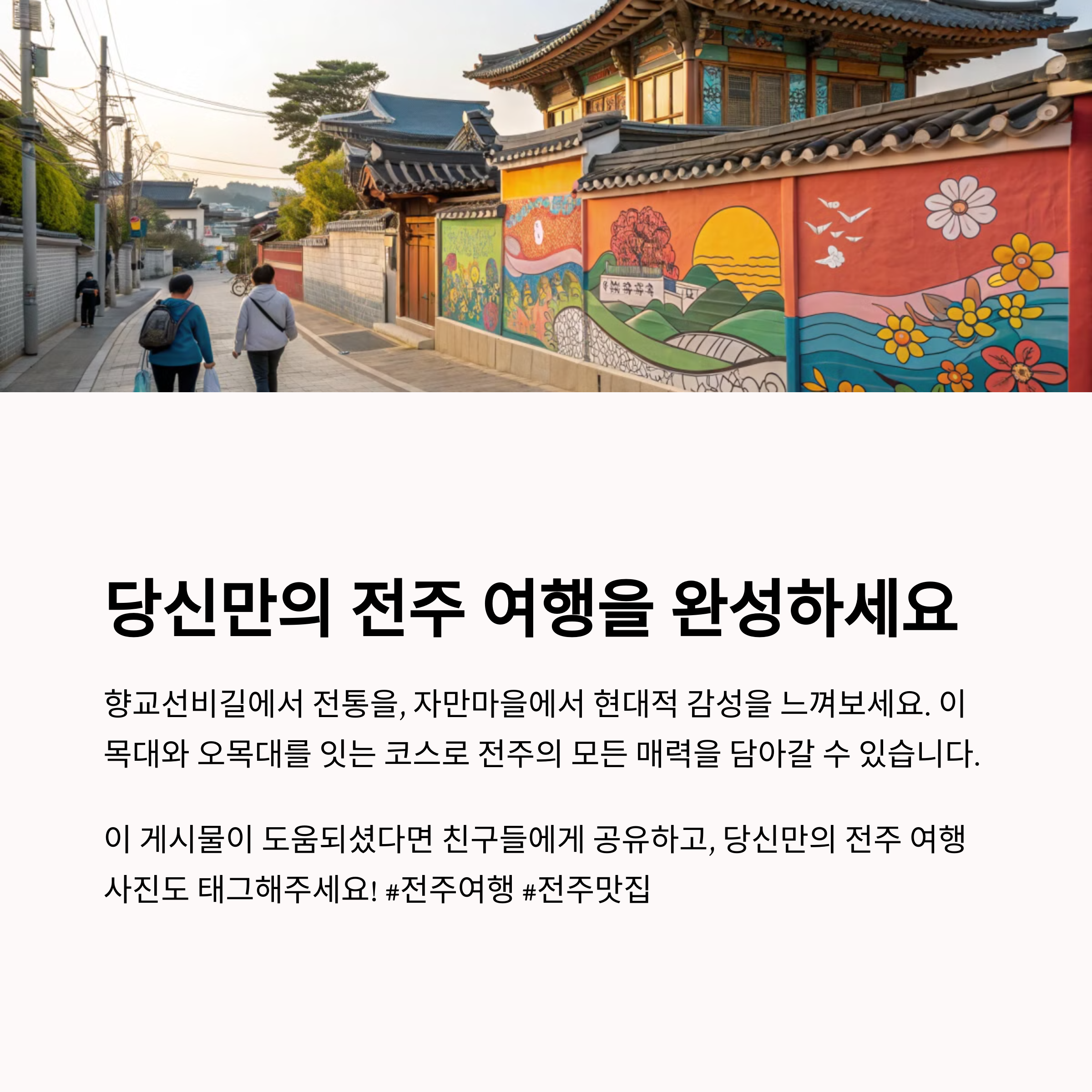 전주 여행은 언제나 새로운 감동을 줍니다. 막걸리골목에서 시작해 오목대, 선비길, 자만벽화마을까지 이어지는 이 코스는 전통과 현대를 넘나드는 여행자들에게 더할 나위 없는 경험이 됩니다. 맛과 풍경, 감성과 휴식을 동시에 누릴 수 있는 전주는 짧은 시간에도 깊은 인상을 남기며, 다시 찾고 싶은 도시로 기억됩니다. 이번 여행이 여러분에게도 소중한 추억으로 남기를 바랍니다.