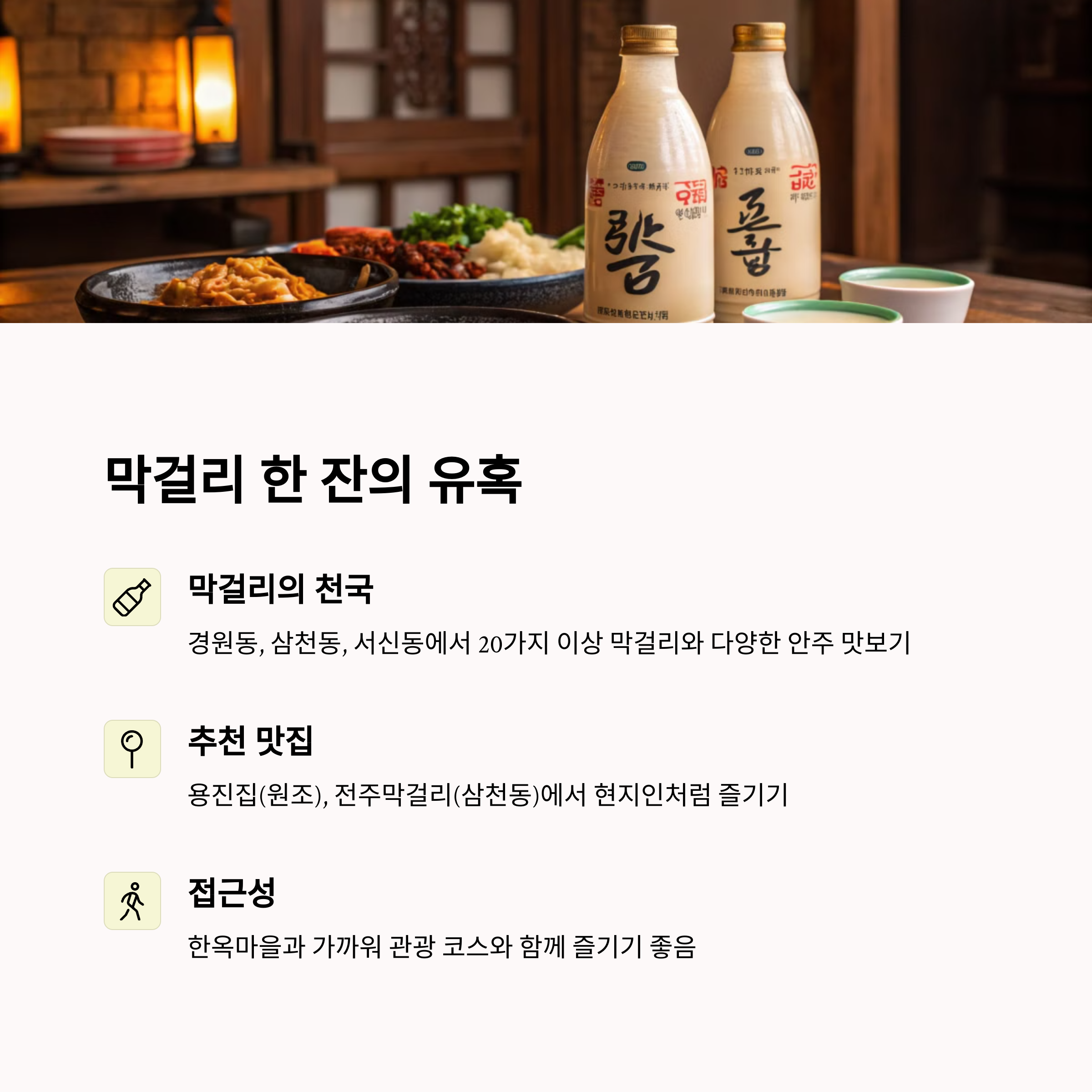 | 전주 막걸리골목 | 다양한 막걸리집과 지역 안주로 유명한 골목입니다. |