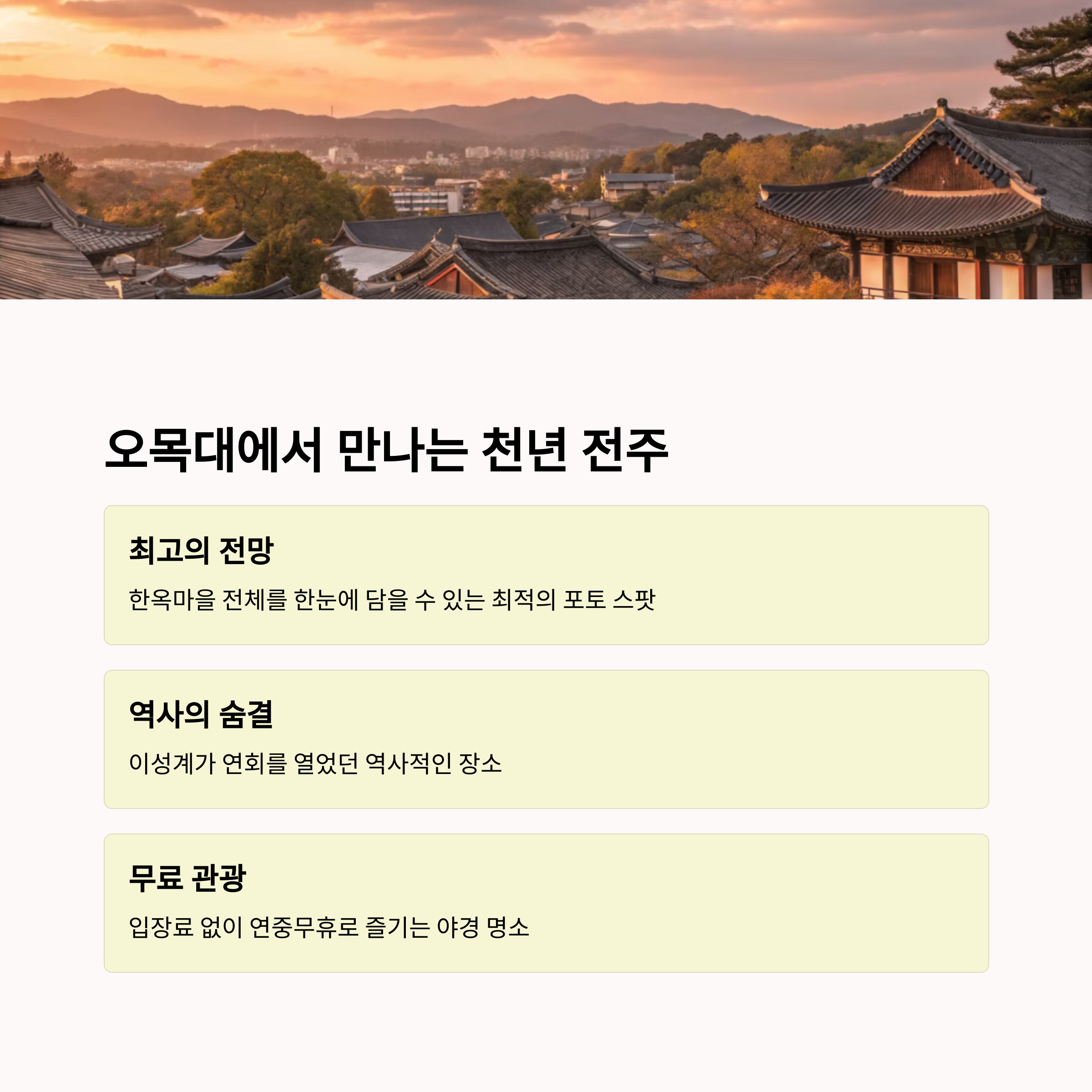 | 오목대 | 한옥마을을 한눈에 내려다볼 수 있는 전망 명소입니다. |