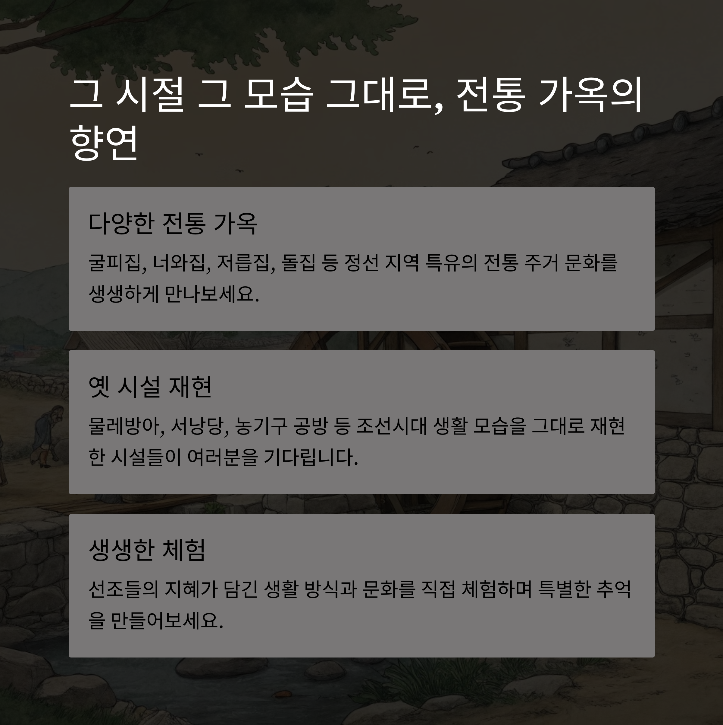 | 전통 가옥 | 기와집, 참나무 껍질 지붕 집, 한지 지붕 집, 제립집, 돌집 등 다양한 전통 가옥을 볼 수 있습니다. |