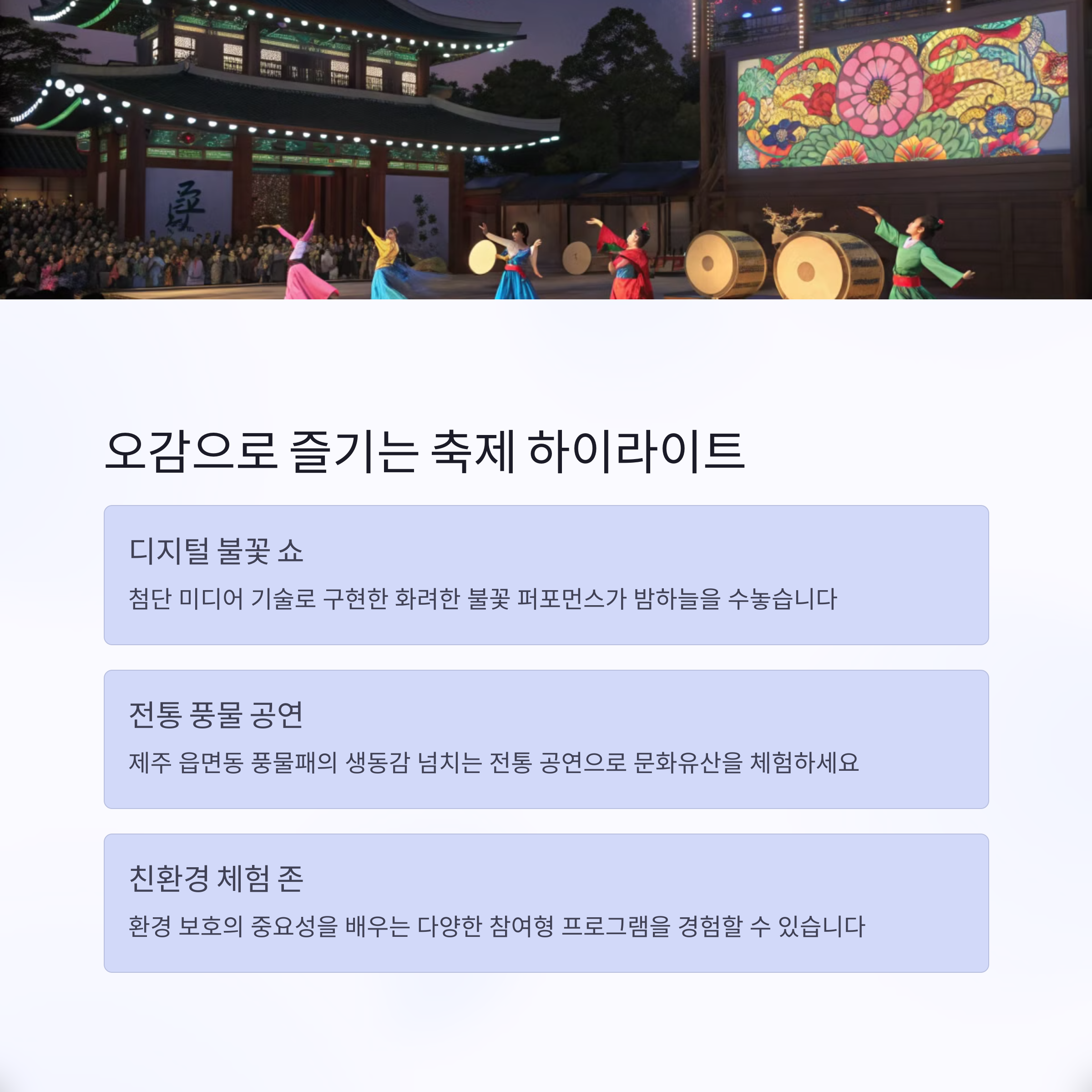 | 정상에서 보는 제주의 풍경이 장관 | 불 대신 빛과 기술을 활용한 친환경 연출 | 오름 정상에서 즐기는 오감 체험형 콘텐츠 |